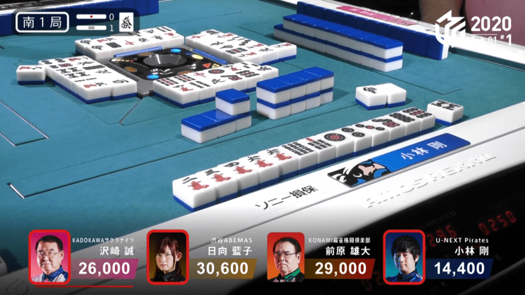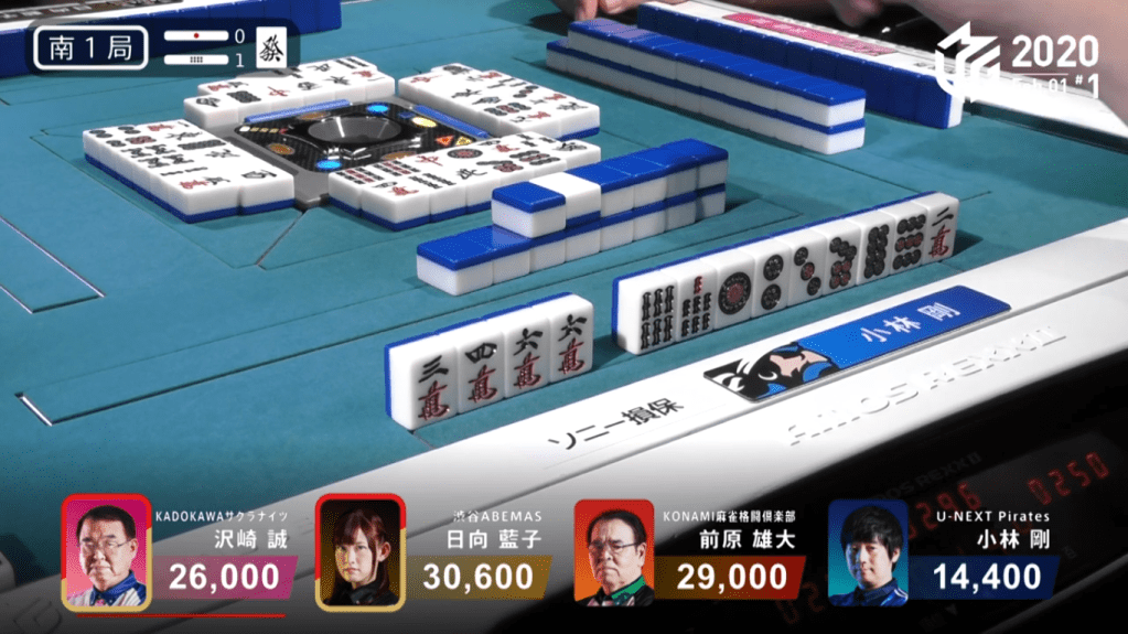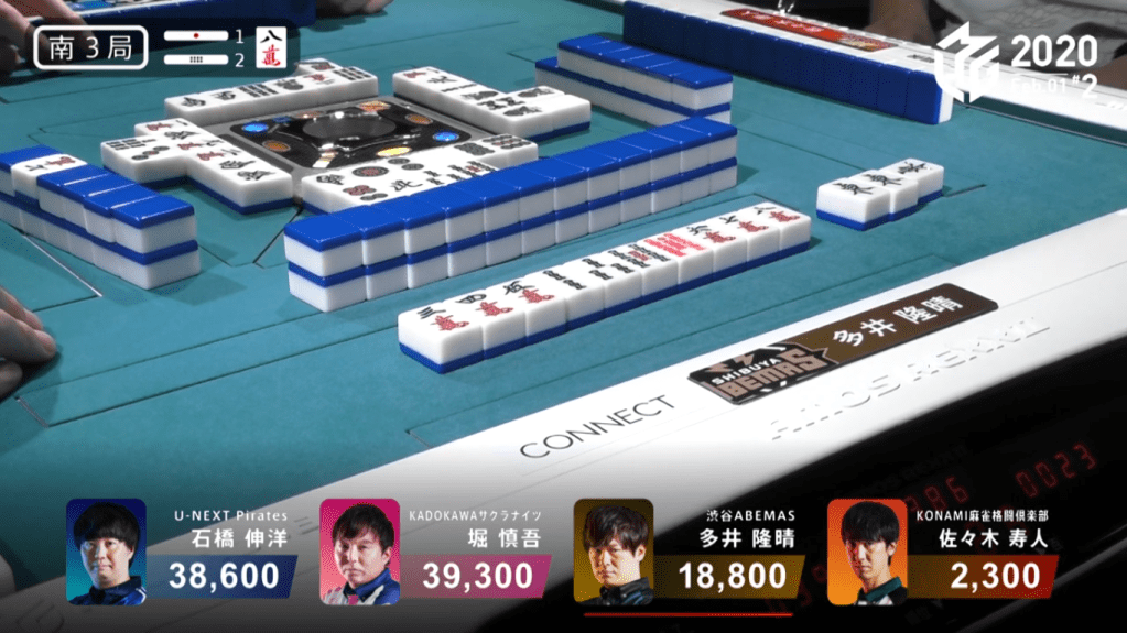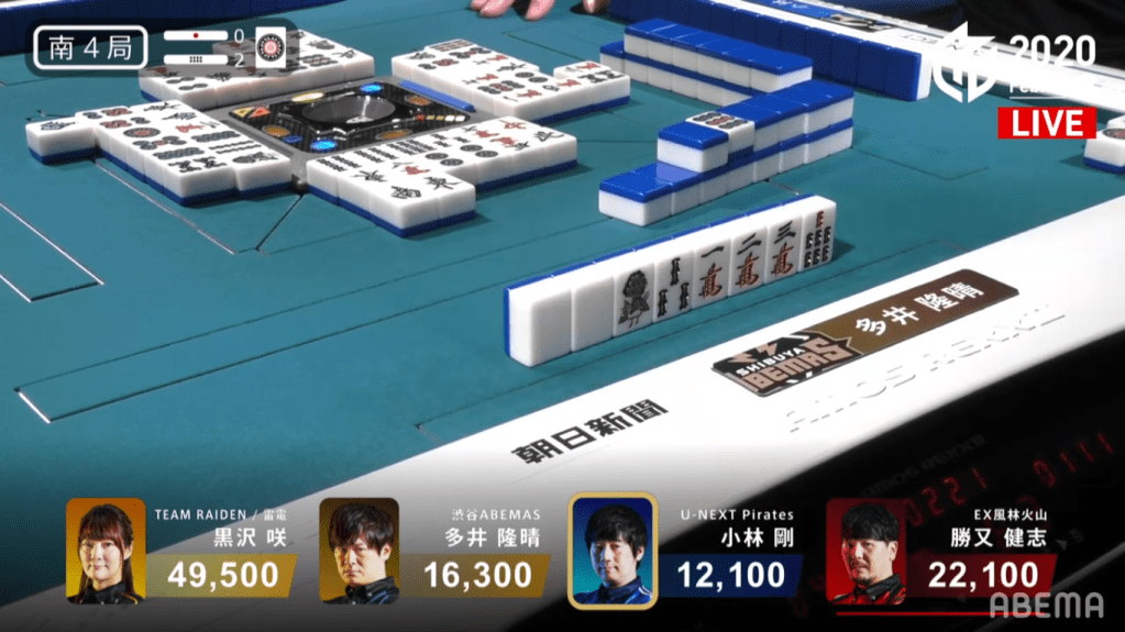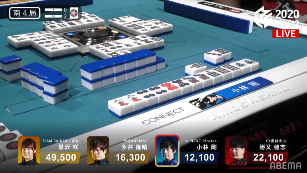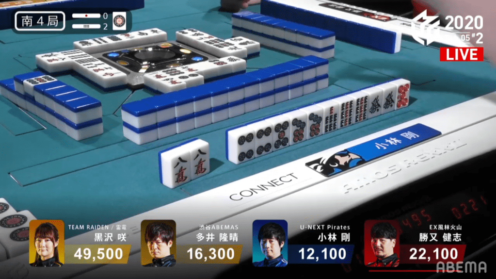 On Kobayashi’s ippatsu draw, he finds the 8s and wins the hand. Kobayashi wins the hand with Riichi/Ippatsu/Tsumo/Pinfu for 1,300+100/2,600+100, plus the riichi sticks from Sawazaki and Hinata. this hand helped turn around Kobayashi’s score and was the biggest factor in Kobayashi’s win that day.