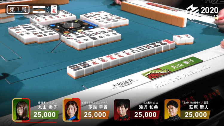 In E1-0, Maruyama the dealer starts of her first game since January 3 with a 3-shanten hand with a 5p ankou with a red dora and a lone 1m dora. By the end of the 1st row, she is iishanten with a ryanemn and a penchan waiting to be completed. Near the start of the 2nd row, Maruyama draws a red 5m to complete her ryanmen and calls riichi on a 3m penchan for mangan minimum. With a good wait and a need to get their team ahead of the Drivens, Kayamori calls a chasing riichi in the middle of the 2nd row on a 14s ryanmen wait. Both Hagiwara and Takizawa begin to fold their hands, making it a waiting game for Maruyama and Kayamori. On the very last tile, Kayamori draws the 3m and deals the houtei to Maruyama. Maruyama Win the hand for Riichi/Hotuei/Dora 1/Aka 2/Ura 1 for 18,000, plus Kayamori’s riichi stick.