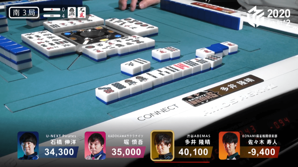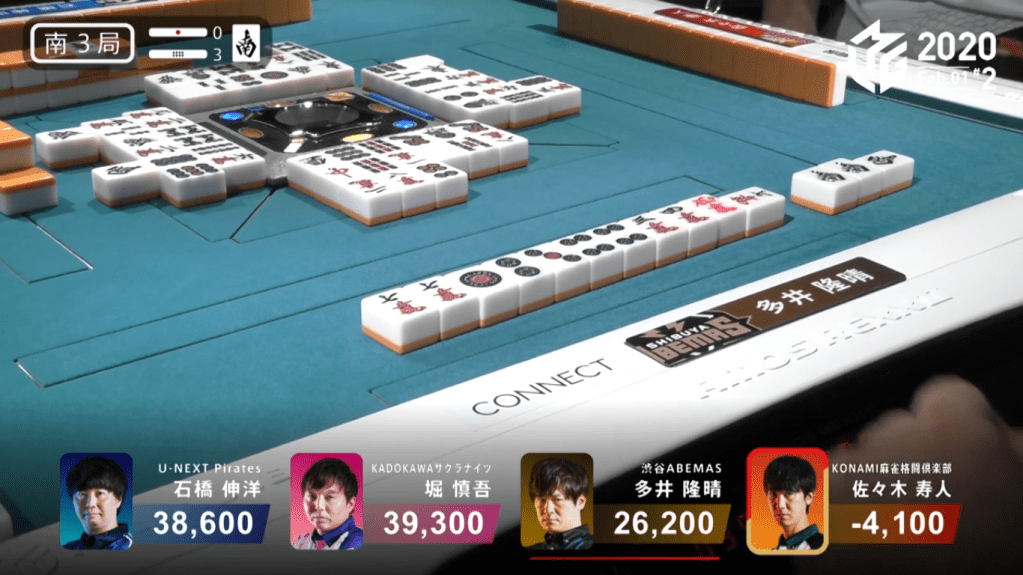 In S3-3, Ooi starts out with a 4-shanten hand with a lone south dora for value. By the end of the 1st row, Ooi gets to 2-shanten and still unable to utilize the south dora. Nearing the end of the 2nd row, Ooi draws a 2nd south dora, allowing him to call it if someone discards it. Soon after that draw, last place Sasaki calls riichi on a north tanki. With so much potential value, Ooi continues to push his hand. When Sasaki discards the south, Ooi calls pon to get to tenpai on a 4p/7m shanpon. Two turns later, Ooi draws the 7m to win the hand. Ooi wins the hand with South/Dora 3/Aka 1 for 4,000+300 all, plus Sasaki’s riichi stick. With the win, it brings Ooi up to 1st place.