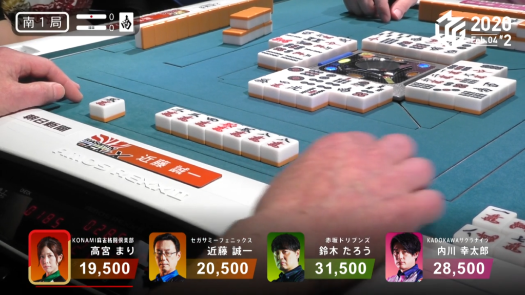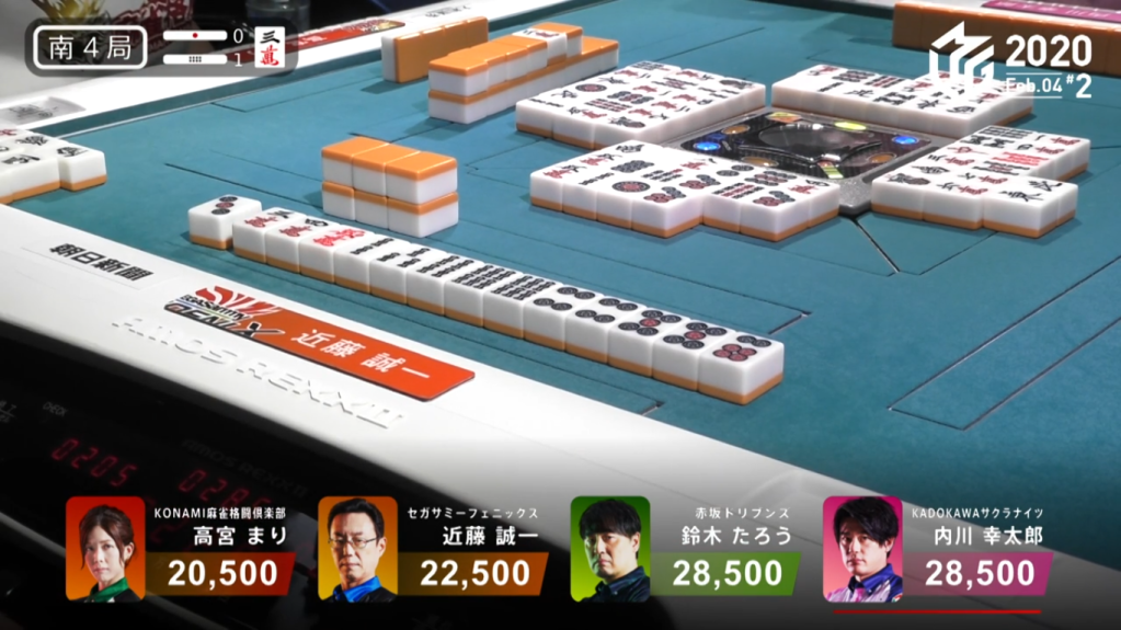 In S1-0, Kondo is in 3rd place and starts out with a 3-shanten hand. With more than half his hand being manzu, there is a distant chance of chinitsu. Through the first row, Kondo didn’t make much ground on the shanten side, but did pick up a few manzu to lean his hand to chinitsu. By the end of the 1st row, he had 9 manzu in his hand. With 11 manzu in his hand by the middle of the 2nd row, Kondo broke up his pinzu block to secure chinitsu. When Takamiya discarded the 8m, Kondo called chii to put him at iishanten. Soon after, he called pon on the 1m to be tenpai on a 5m/8m shanpon wait. Having a red dora, he was tenpai for haneman to put him in the lead. At the start of the 3rd row, Takamiya tries to challenge Kondo by calling riichi on a 47m ryanmen wait. With an expensive hand, Kondo kept pushing against the dealer riichi. On Kondo’s second-to-last draw, he draws the 5m and calls tsumo. Kondo wins the hand with Chinitsu/Aka 1 for 3,000/6,000, plus Takamiya’s riichi stick.