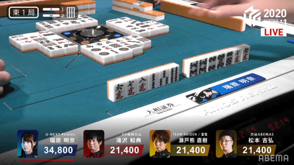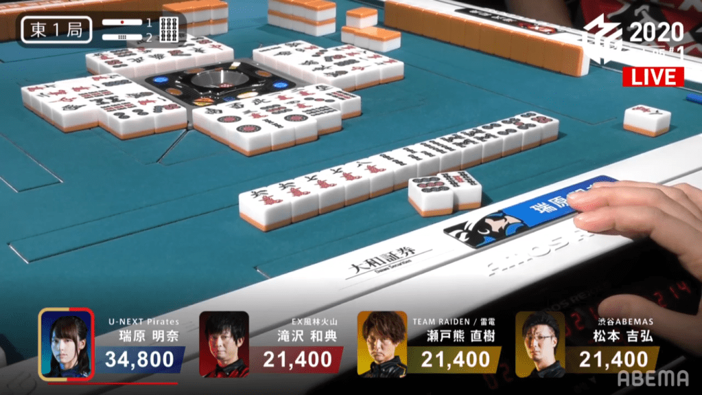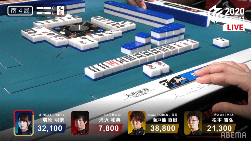 In S4-0, 2nd place Mizuhara is 6,700 behind 1st place Setokuma. She would need a 3/40 direct hit, a 3/50 tsumo or a mangan general ron to get to 1st. Mizuhara’s hand starts out well, being 3-shanten with an embedded dora and red dora. With a pair of 9s in her hand, all she can do is hope and wait to call riichi. By turn 5, her hand has lost of flexibility and has a good chance of a good wait at tenpai. The very next turn, she gets to tenpai and calls riichi on a 36s wait. If the 6s comes she can call ron or tsumo to give here the iipeikou and get to first. If she gets the 3s, she would have to hope to tsumo it or get an ura dora. Seeing that all the 6s are in people’s hands, Pirates fans put their hopes in the wall for the tsumo. In the middle of the 2nd row, Mizuhara finds the 3s and wins the hand. Mizuhara wins with Riichi/Tsumo/Dora 1/Aka 1/Ura 1 for 2,000/4,000 to win the game.