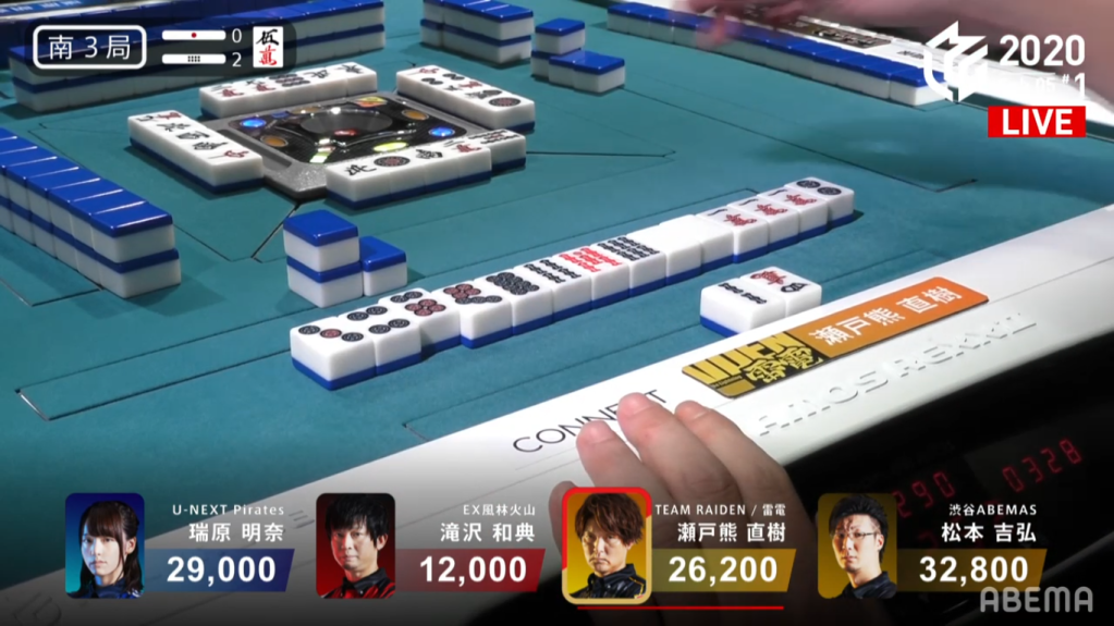 In S2-0, Matsumoto is in 2nd place and looking to chase 1st place Mizuhara. He starts off with a 3-shanten hand with a dora. In his first 6 draws, he picked up only pinzu and honours, naturally pulling his hand towards honitsu. By the end of the 1st row, Matsumoto is iishanten for chiitoi and honitsu with two dora. On his very next turn, he gets to tenpai and says dama on a 3p tanki wait. With Mizuhara being very close to tenpai, she discards the 3p and deals into Matsumoto. Matsumoto wins the hand with Honitsu/Chiitoi/Dora 2 for 12,000. Directly hitting Mizuhara, it brings Matsumoto into 1st place.