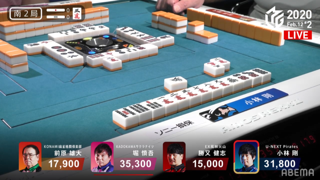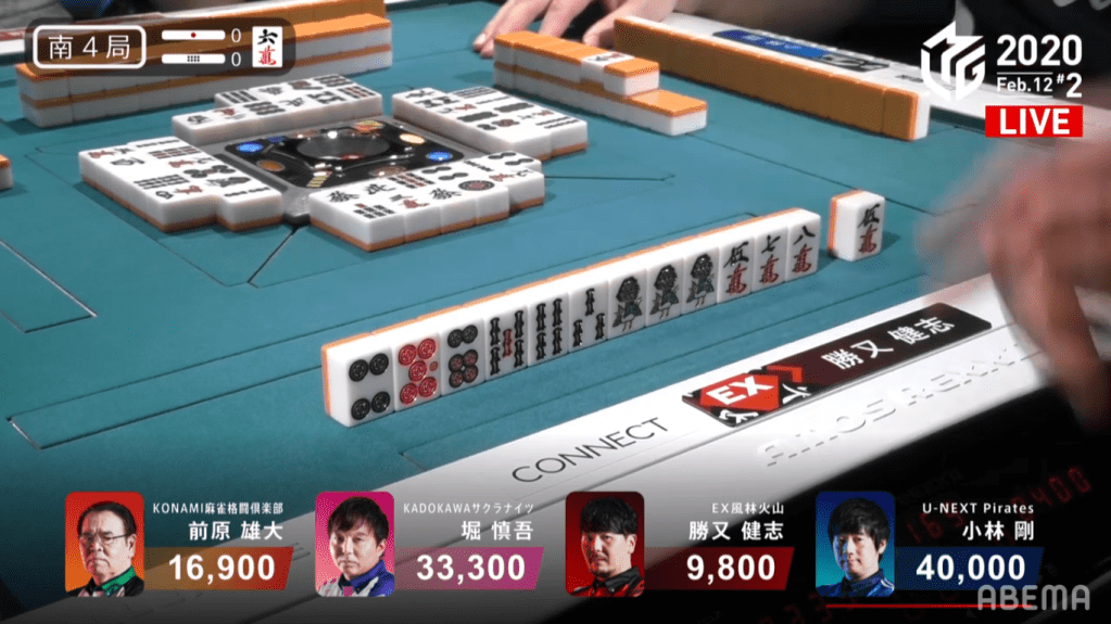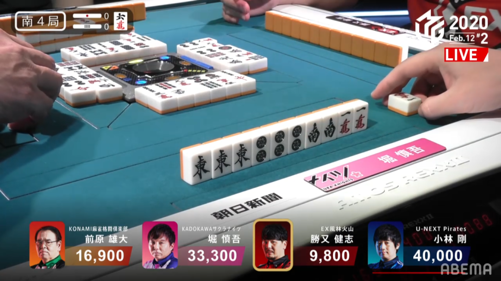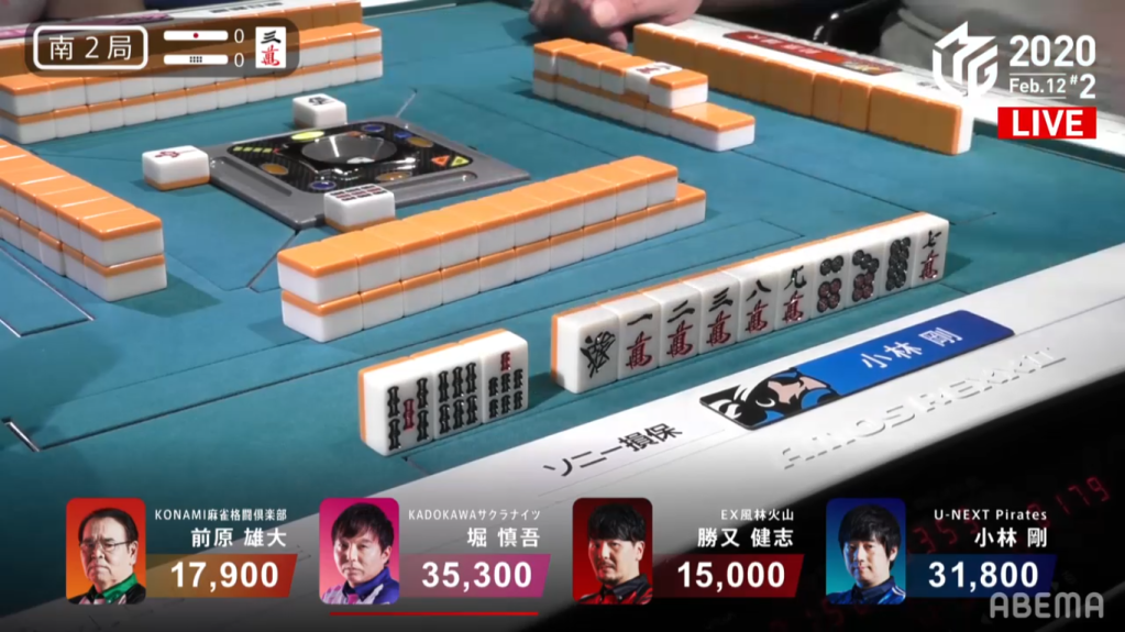 With February 12 being Kobayashi Go’s birthday, both he and the viewers were looking for a birthday present for him. With Kobayashi’s first 13 tiles, he already had 3 completed groups and a 89m block. With Kobayashi’s first draw, he gets the 7m and now has 4 completed groups. Only missing a pair, Kobayashi calls double riichi and waits on a green dragon tanki wait. Hori was holding the green dragon in his starting hand, but he managed to not throw it. When Maehara drew it at the end of the 1st row, he also managed to not throw it.