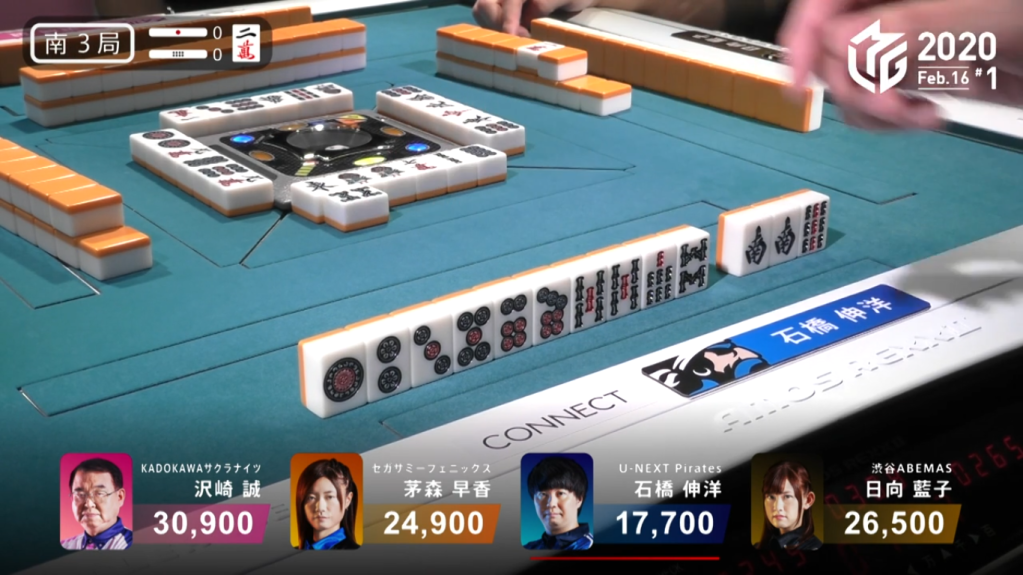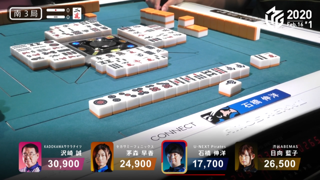 In S3-0, dealer Ishibashi is in 4th place and Kayamori is in 3rd place. Ishibashi and Kayamori both start out with a 2-shanten hand, Ishibashi having a south pair and Kayamori with a pinfu-looking hand. By the end of the 1st row, both of them are iishanten. At the start of the 2nd row, Ishibashi draws to tenpai and calls riichi on a 5s/south shanpon wait. With a dealer riichi on the table, Kayamori needed to be careful. In the middle of the 2nd row, Kayamori gets to tenpai on a 6m kanchan. When she draws the dangerous 5p the very next turn, she has to decide whether to push or fold.