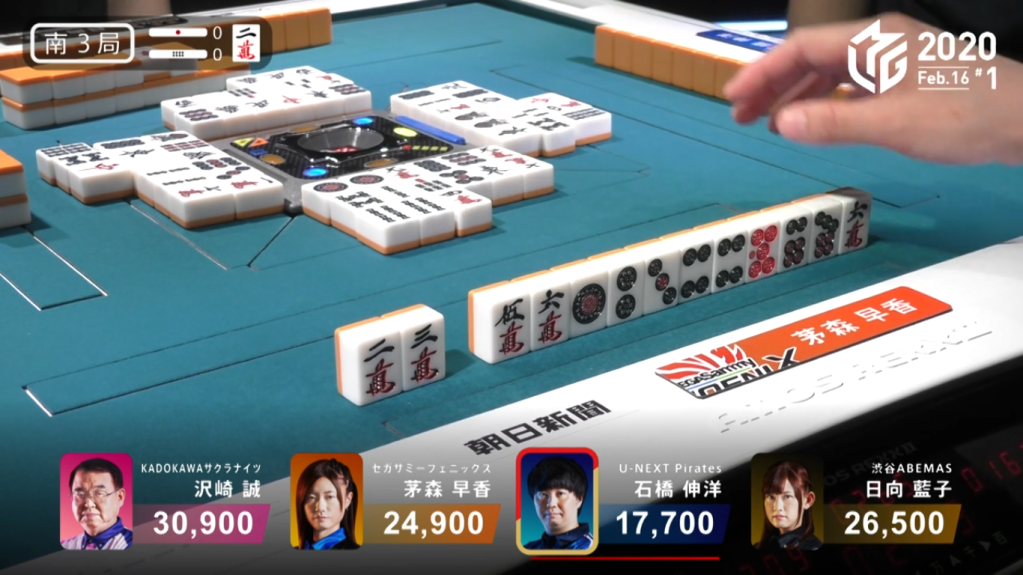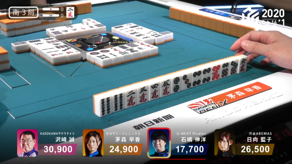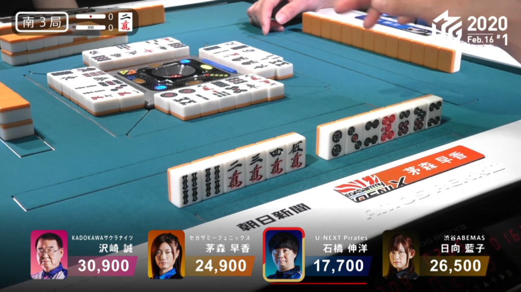 In S3-0, Takizawa has a slim lead as the dealer. Takizawa starts out with a poor 5-shanten hand, but has two red dora and a regular dora to give his hand value. Through the first row, he cleans out all the useless honours in his hand and ends up. As he does this, Asakura calls a very quick riichi on the first discard on a 3s/red dragon shanpon. By that point, Takizawa was already 2-shanten with a possible pinfu and even a ryanpeikou chance. With no tiles to fold with, Takizawa continues to push his hand. At the end of the first row, Hagiwara gives Takizawa even more trouble by calling riichi on a 69p ryanmen wait. getting to ryanpeikou iishanten on Hagiwara’s ippatsu turn, Takizawa continues his push. Three turns later, Takizawa draws to tenpai. Even though he needed to discard the dora, he pushes the hand and waits on a 14m ryanmen wait, with the 1m giving him ryanpeikou. At the start of the 3rd row, Asakura draws the 1m and deals into Takizawa. Takizawa wins with Pinfu/Ryanpeikou/Aka 2 for 18,000 and a big lead.