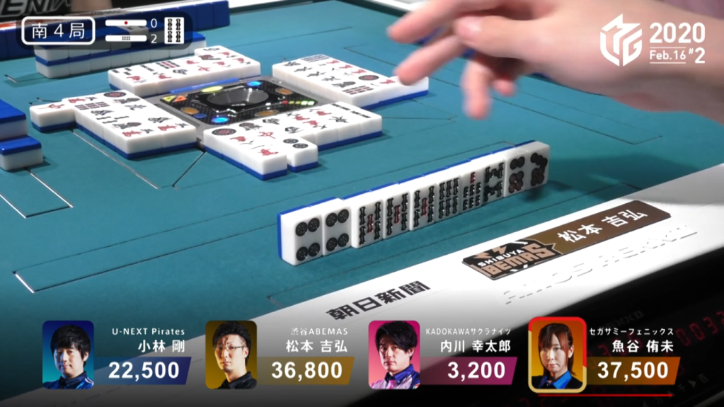 When Uotani discards the dora 4s, Matsumoto instantly calls pon and wait in tenpai with a 58p ryanmen wait. With no way to continue safely and Matsumoto likely in tenpai, Kobayashi discards tiles that are safe against Uotani.