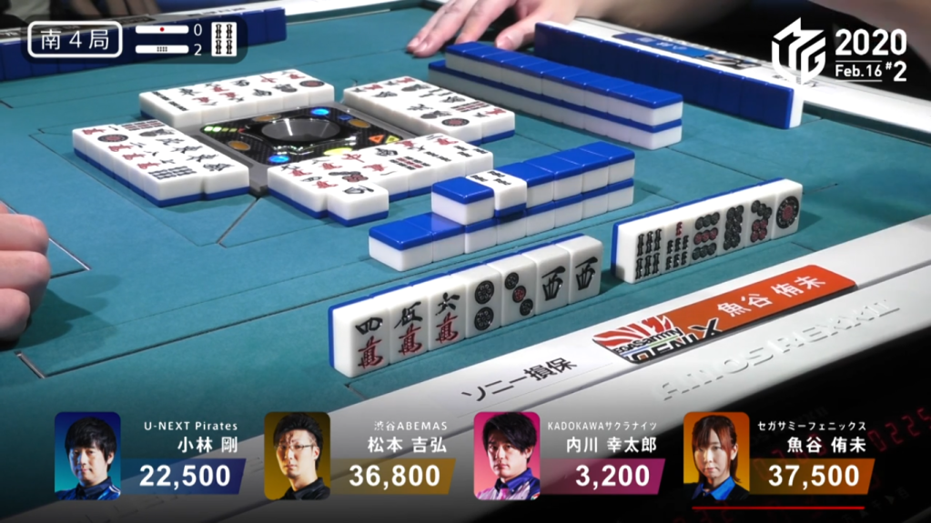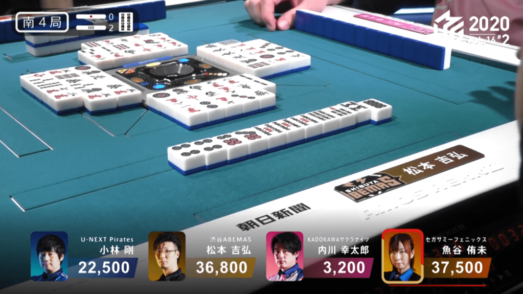 In S4-2, only 700 points separate 1st place dealer Uotani and 2nd place Matsumoto. With 3rd place Kobayashi trying to help his team get to the semis, he has multiple options. Since the Pirates are in 8th place and the Phoenix are in 7th place, he really doesn’t want Uotani to place 1st. Kobayashi can prevent this by getting a 3/30 or higher tsumo or any ron. If Kobayashi were to tsumo a haneman, it would put him into 1st place and Uotani in 3rd. However, he has another option: deal into Matsumoto. Because Matsumoto is so close to 1st, he will be aiming for it. Since the difference in placement bonuses is +40 for 1st and 2nd (compared to the usually +20 for all the other placements), having Matsumoto in 1st would considerably reduce the difference between Uotani and Kobayashi (20 point difference instead of 60 points).