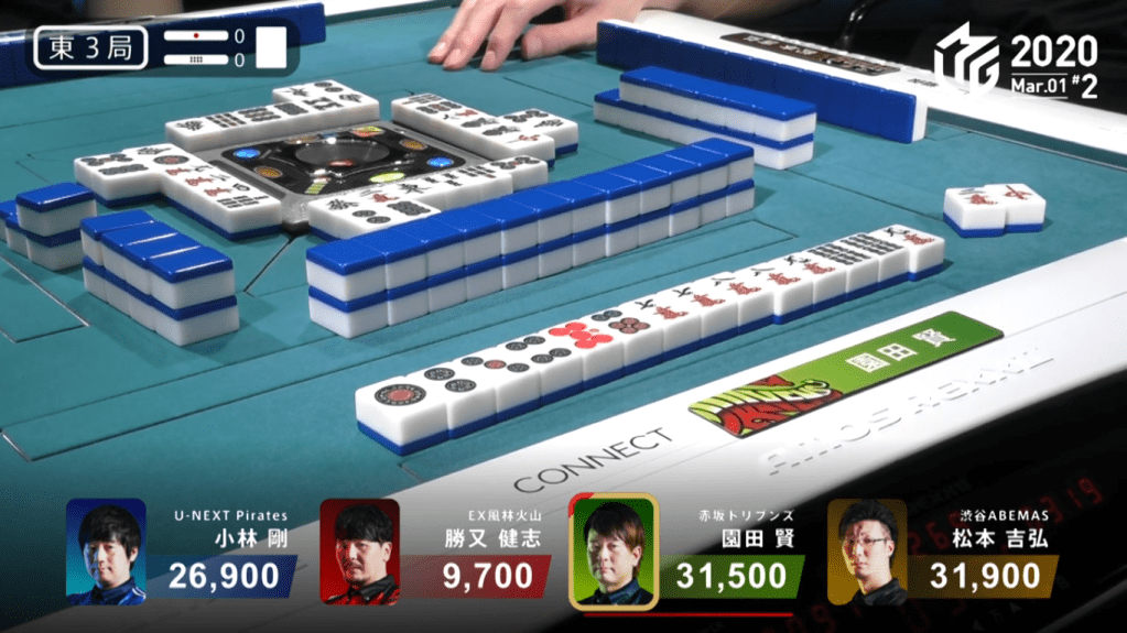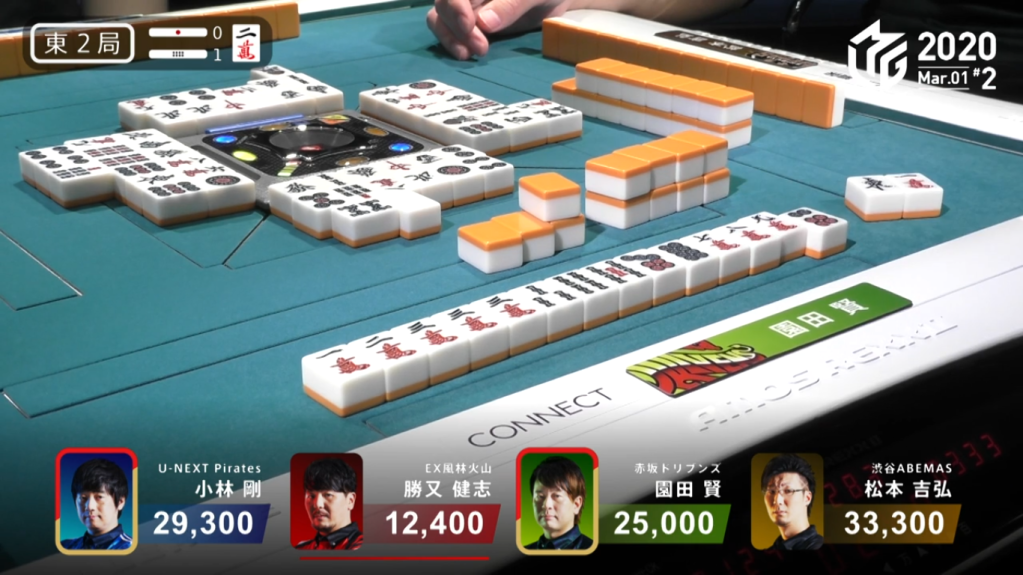 In S2-0, Matsumoto is the dealer and is 100 points away from 4th place. Matsumoto starts out with a 4-shanten hand with a red dora. On turn 3, he pairs up one of his lone yakuhai to give him a clear yaku objective and gets him to 2-shanten. By the end of the 1st row, Matsumoto has three ryanmen choices to go along with his callable green dragon. Drawing a third green dragon in the 2nd row, Matsumoto got himself to iishanten and called pon on the 9m to get to tenpai on a 58p ryanmen soon after. On his very next turn, he draws a 4th green dragon and calls kan. The rinshan misses and he continues the waiting game. The turn after that, he draws the 9m and calls kan. The rinshan misses again and he keeps waiting. Early in the 3rd row, Katsumata discards the 8p and deals into Matsumoto. For han, Matsumoto had a Green Dragon(1) and Red Dora 1. For fu, the calculation is a bit more harder. He gets the base for winning the hand (20), plus the fu from the closed kan of green dragon (32) and the fu from the open kan of 9m (16). Adding it all up and rounding it up to the nearest 10, Matsumoto’s hand is 70 fu (20+32+16=68, rounds to 70), a rarity for open hands.