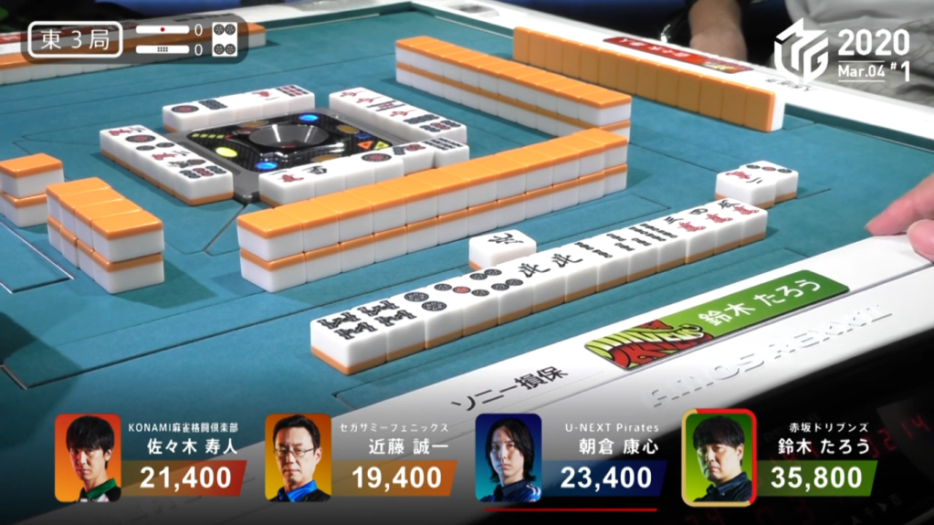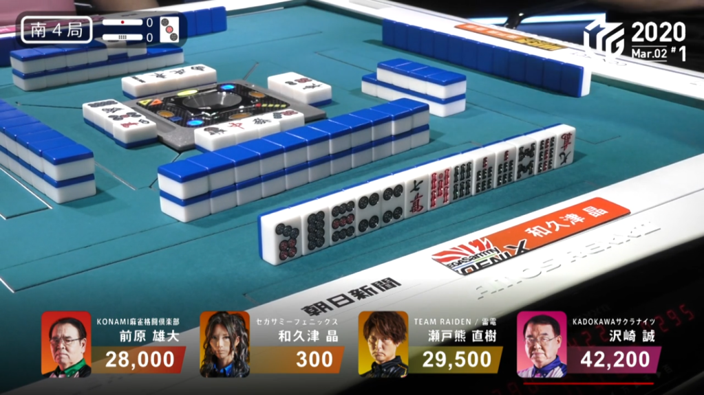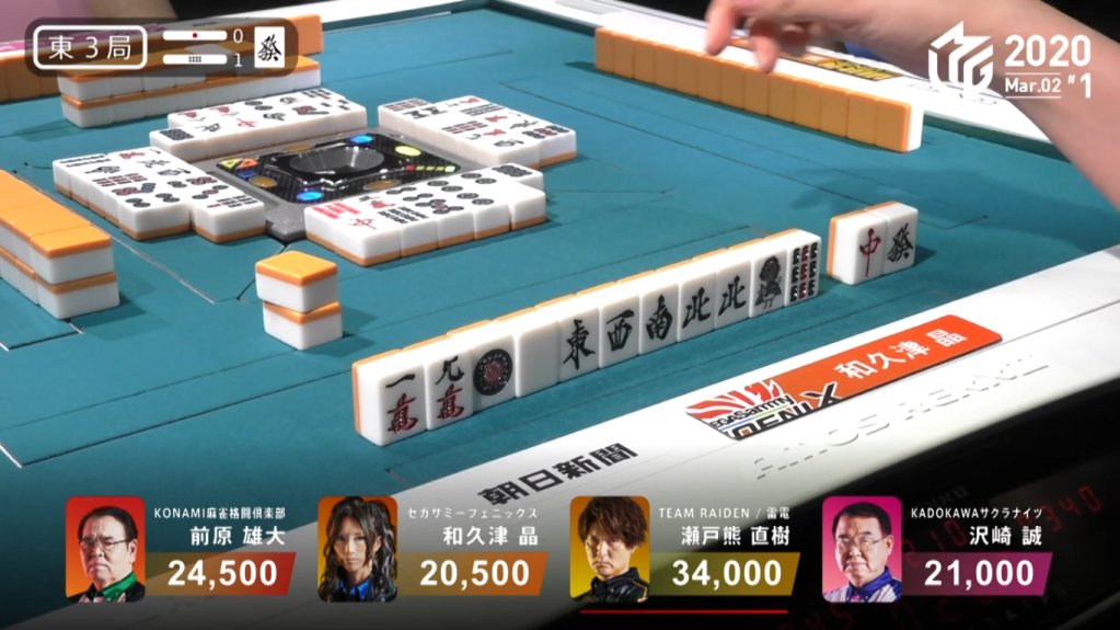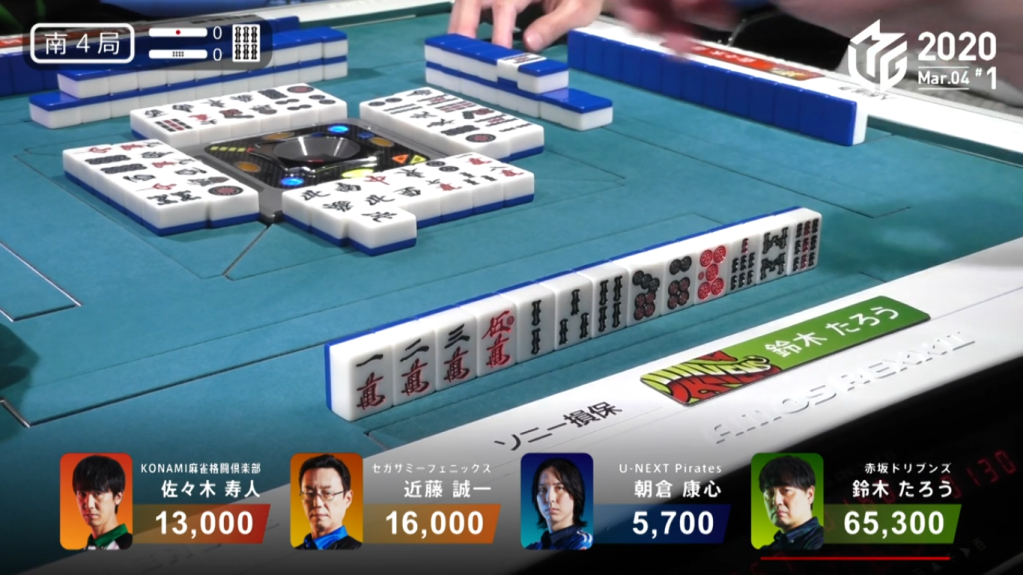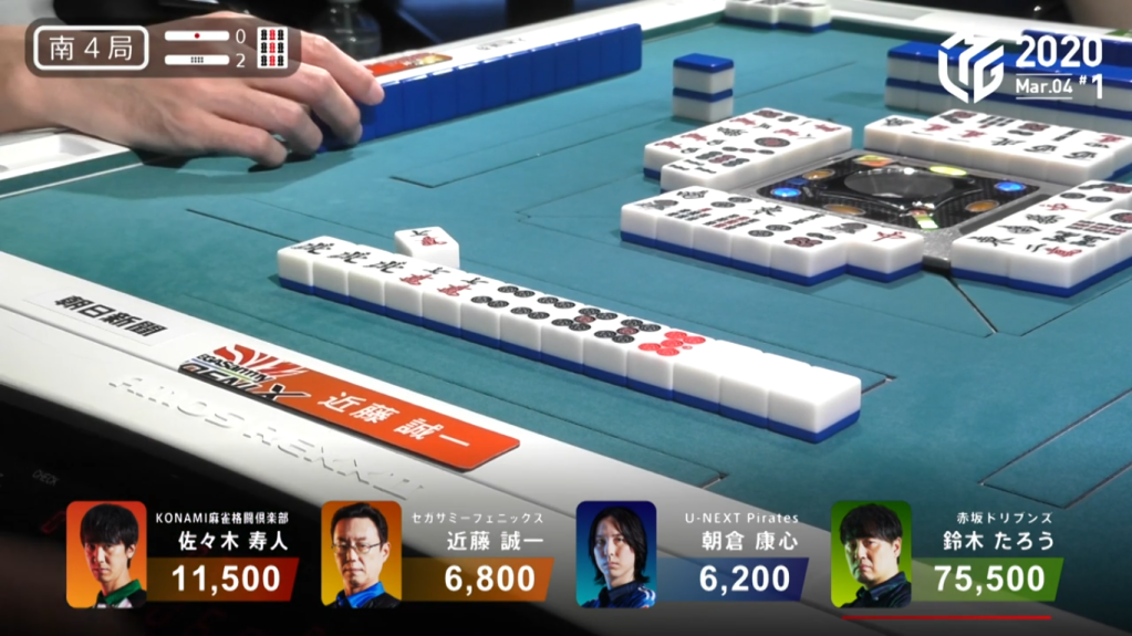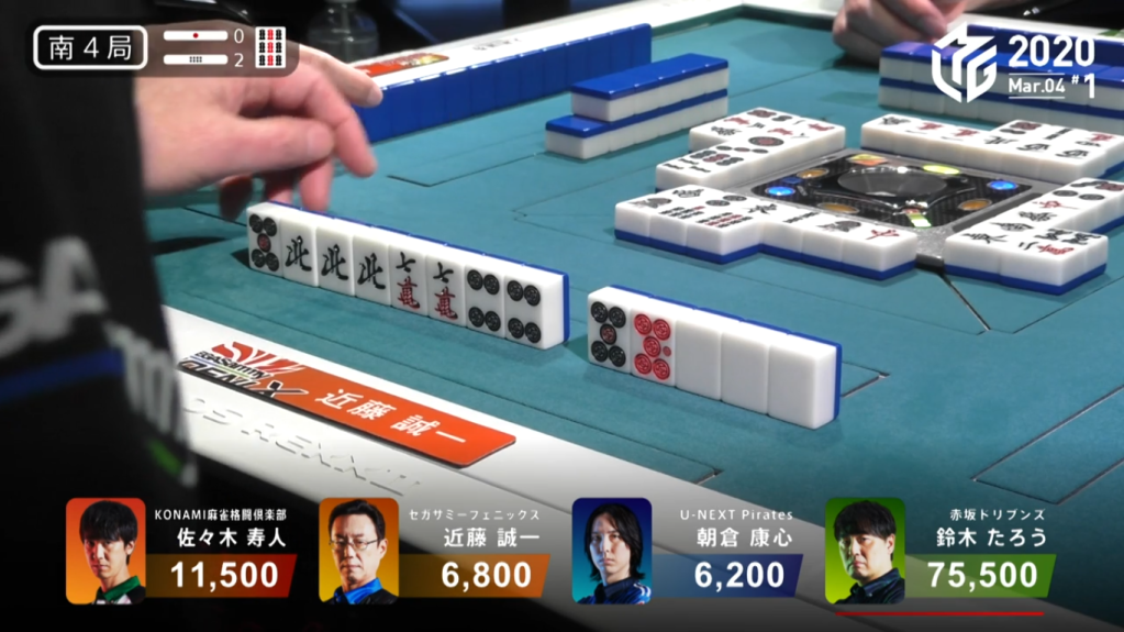 Because Asakura is in front of Taro in turn order, Taro would be headbumped and only Asakura would win the hand. However, because of Asakura’s urgent need to win by tsumo, Asakura doesn’t even say ron and lets the win go to Taro. Taro wins the hand with Riichi/Aka 2 for 7,700, plus Asakura’s riichi stick. This high-level play allowed Asakura to play one more hand and have a better chance to get to 3rd because the point difference was so much closer.