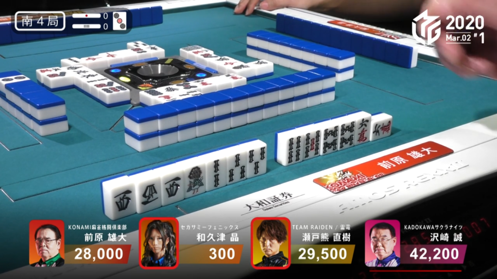 With Taro trying to continue his rout and going efficiently, Taro discards the 7m at the end of the 2nd row and deals into Kondo. Kondo wins the hand with Toitoi/White Dragon/Sanankou/Aka 1 for 12,000+600. With the win Kondo went from 3rd to 2nd and got his team some well-needed points.