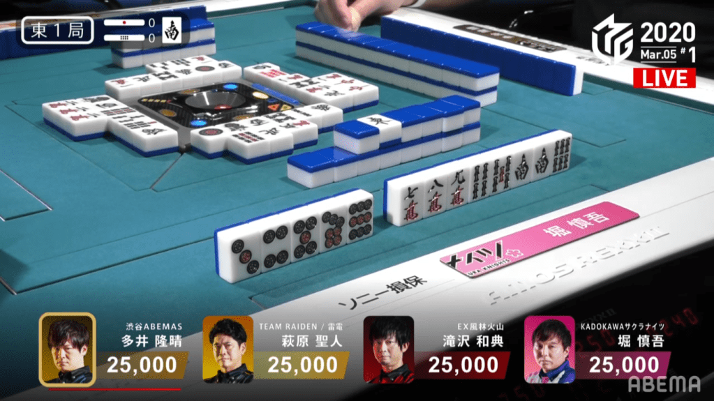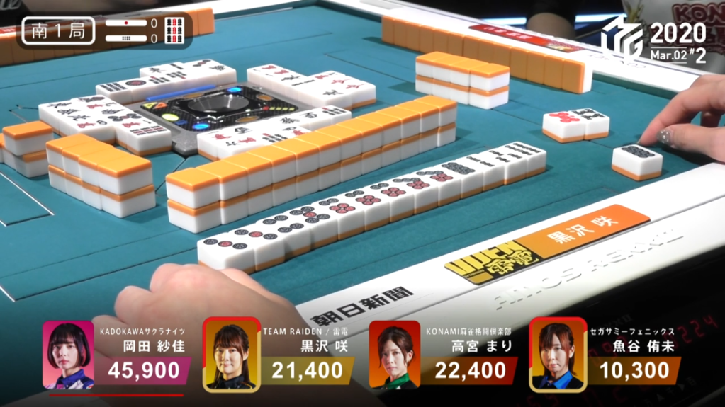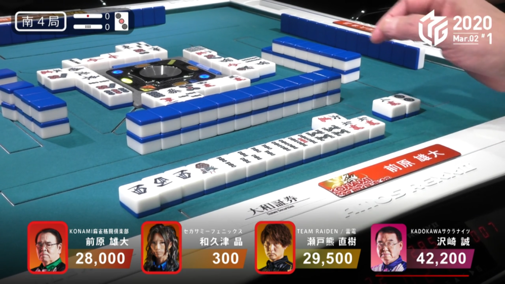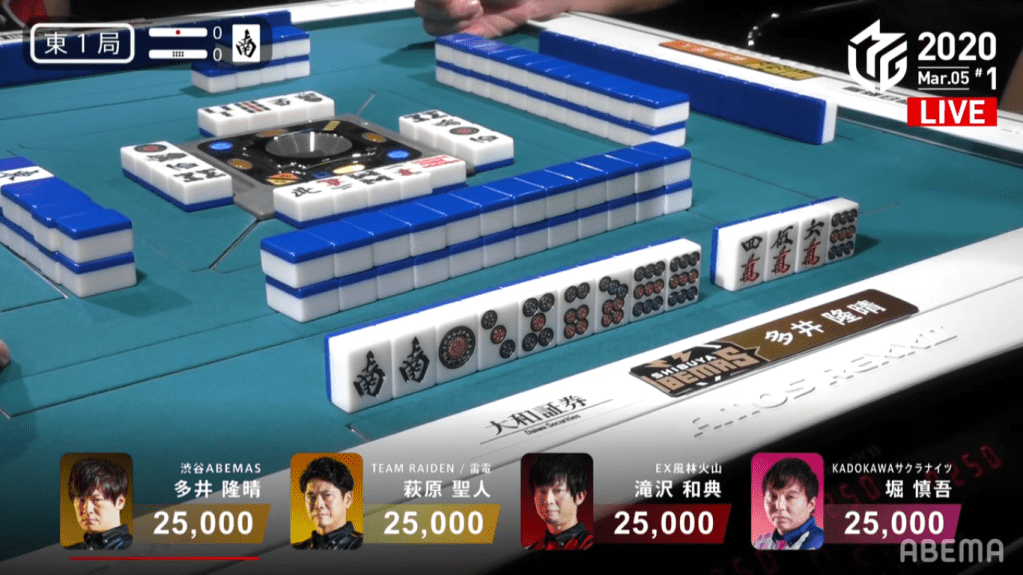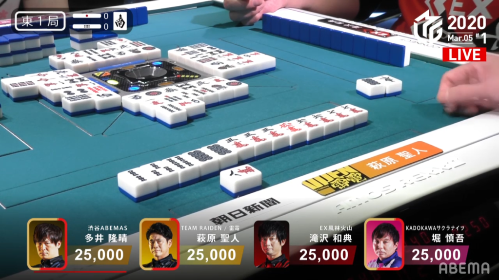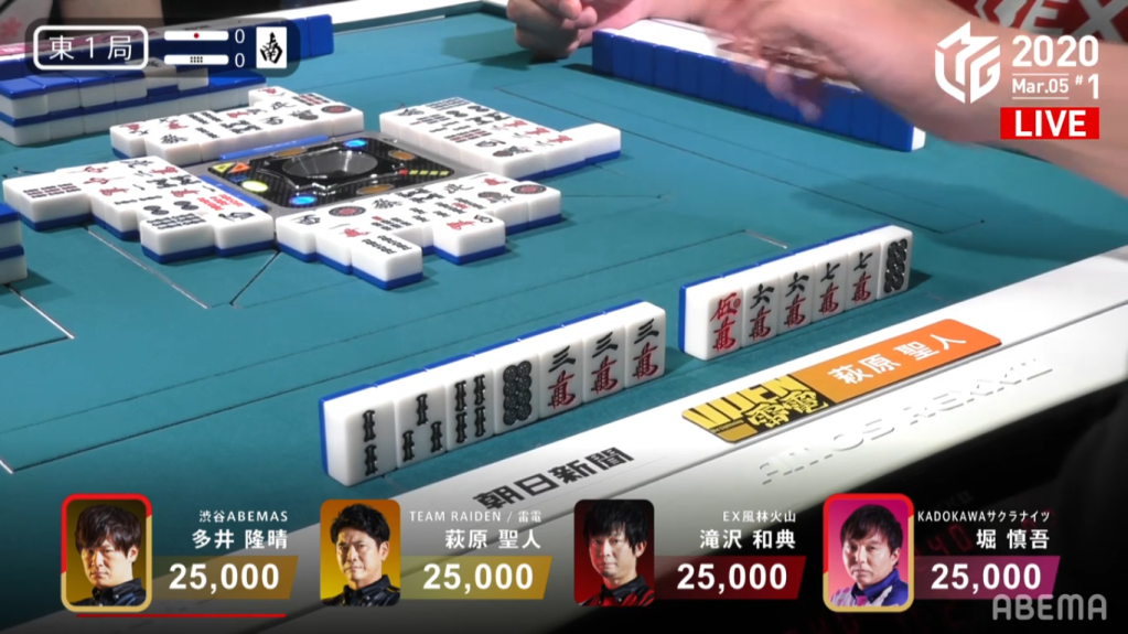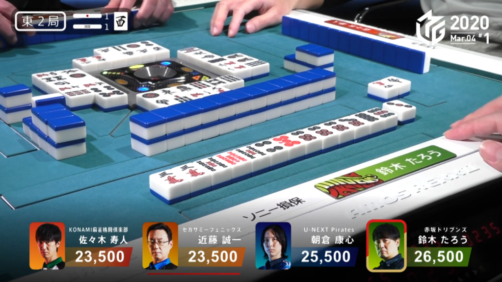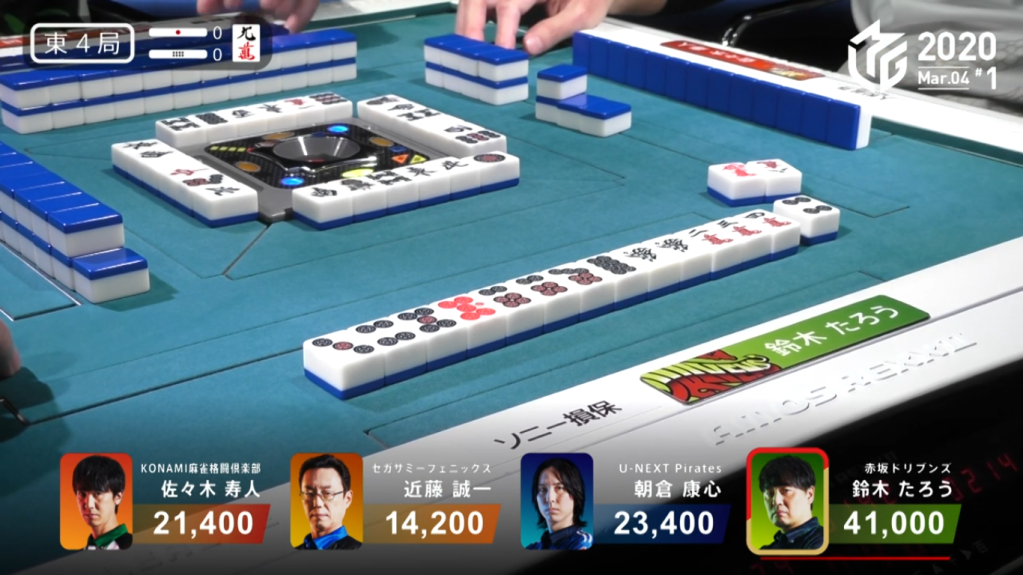 In E1-0, a simple called tanyao hand from Taro and a riichi from Asakura brought the hand to a draw, with Taro and Asakura both getting 1,500 points.