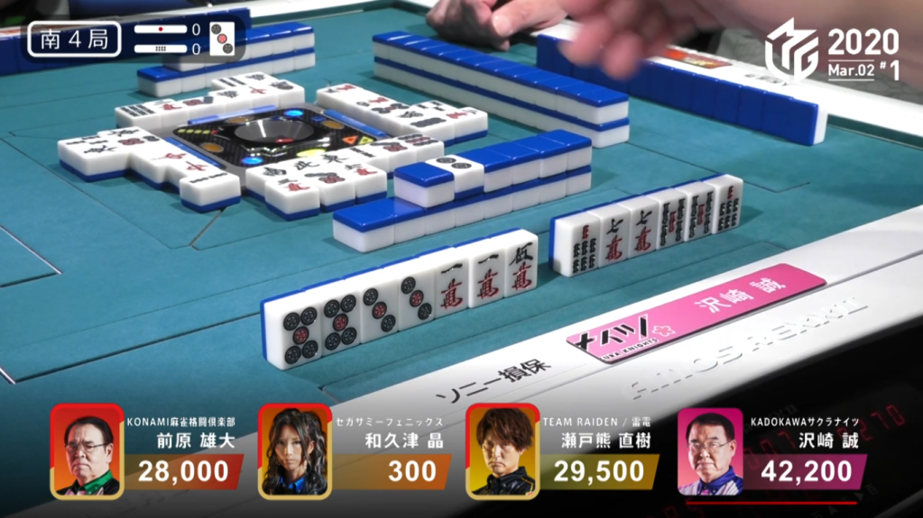 On Sawazaki’s draw during Maehara’s ippatsu turn, Sawazaki gets to tenpai, but discards the wrong tanki and ends up dealing into Maehara with his 6m discard.