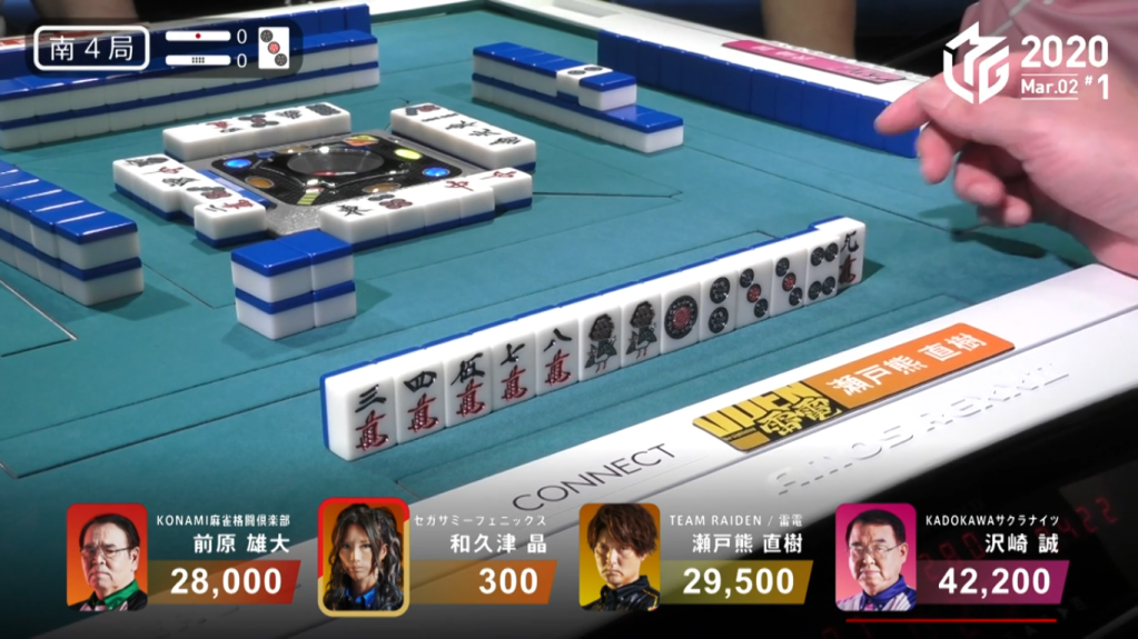 Two turns later, Setokuma gets to tenpai and calls riichi on a 25p ryanmen wait. If Setokuma wins the hand by tsumo, it would be enough for mangan and surpass Sawazaki because of Wakutsu’s riichi stick.