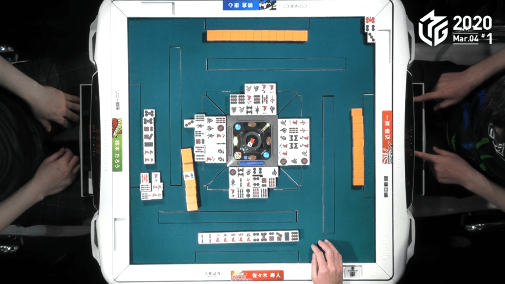 If Asakura calls riichi and calls ron, it would only be worth 2han/40fu, which is not enough to get to 3rd. However, if Asakura calls riichi and wins by tsumo it would be three han (Riichi/Tsumo/Tanyao) and he would get 40 fu (Winning base [20], two ankou of inside tiles [4×2], kanchan wait [2] and win by tsumo [2], 32 rounds to 40). Since a 3han/40fu hand is worth 1,300/2,600, it would give Asakura a 6,500 gain on Sasaki (5,200 earned by Asakura, 1,300 lost by Sasaki). Add to that the 1,000 from Taro’s riichi stick and it gives Asakura enough points to take 3rd.