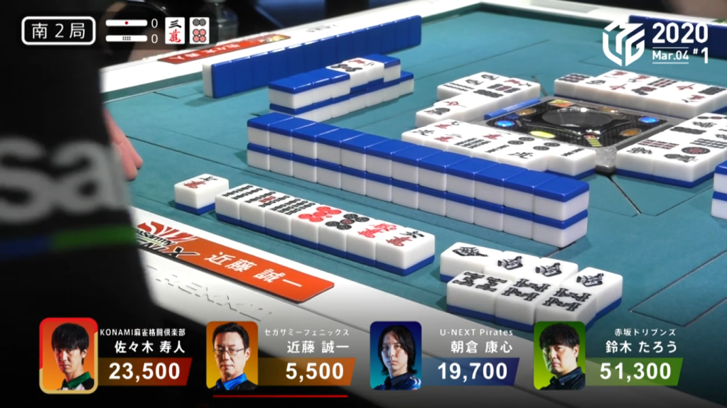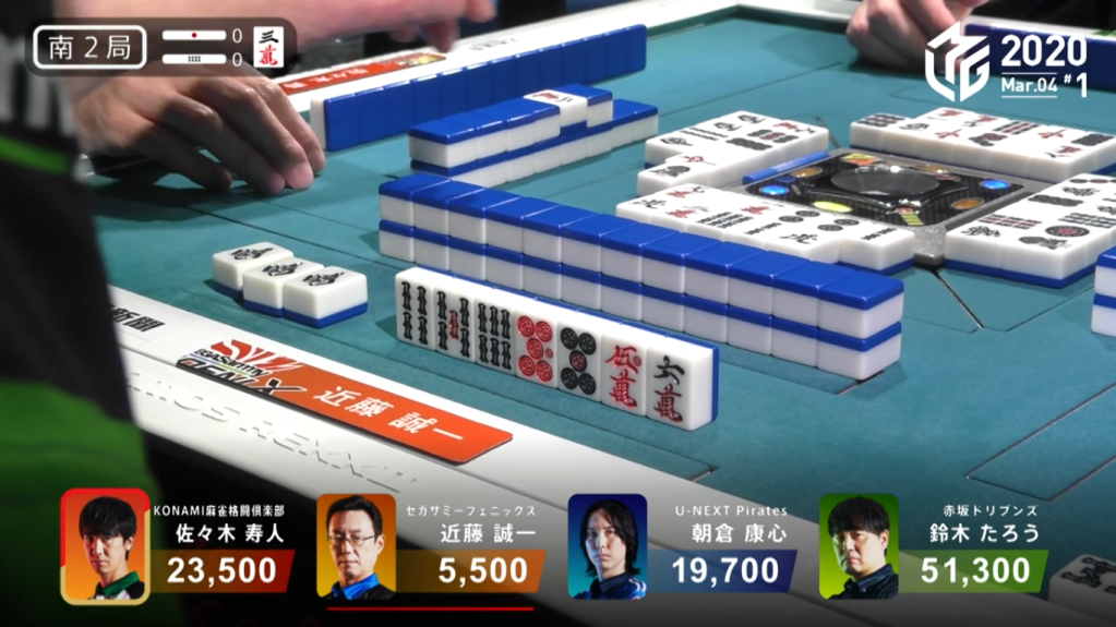 In S2-0, Kondo is in 4th place, 14,200 behind 3rd place and the dealer. He starts out with a 4-shanten hand with two red doras and a pair of souths. By the end of the 1st row, Kondo is only 2-shanten and still looking to make his south pair a triplet. Around the same time, Sasaki gets to tenpai and calls riichi on a 25p ryanmen wait. With Kondo in last place, he continues to push his hand. Kondo calls pon on the 8s to get to iishanten and a south wind draw the very next turn gets Kondo to tenpai on a 47m ryanmen wait. When Sasaki discards the 4th south in the middle of the 2nd row, Kondo has the option to call kan. Kondo seizes the opportunity to get some extra points and calls a rare daiminkan.