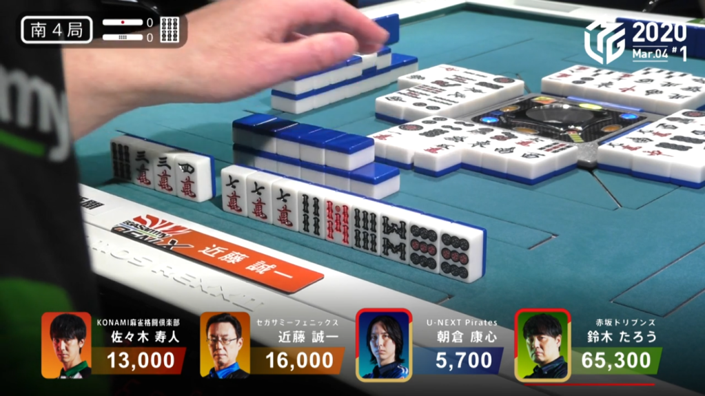 In S4-1, Kondo is in 4th place and 3,100 behind 3rd place Maehara. Kondo starts out with a 4-shanten hand with sanshoku being the only conceivable significant value in the hand. Through the first row, Kondo filled got rid of the slow honours and terminals to try to give the hand tanyao. By the end of the 1st row, Kondo is iishanten with a red dora and tanyao guaranteed. Keeping his hand flexible, he can also add pinfu and/or riichi to the hand to sufficiently surpass Maehara. In the 2nd row, Kondo adds iipeikou flexibility while Maehara rushes his hand by calling a pon on the green dragon. In the middle of the 2nd row, Kondo gets to tenpai on a 47m wait. If Kondo were to stay dama, he would already get to 3rd place with the Pinfu/Tanyao/Aka 1 hand. However, if everything lines up right with riichi, Kondo can actually get to baiman with a Riichi/Ippatsu/Tsumo/Pinfu/Tanyao/Iipeikou/Aka 1/Ura 1, enough to catapult him to 1st place. With the need to get any points to get to the semifinals and the very small but possible chance to take top spot, Kondo calls riichi on the 47m ryanmen.