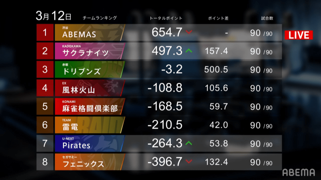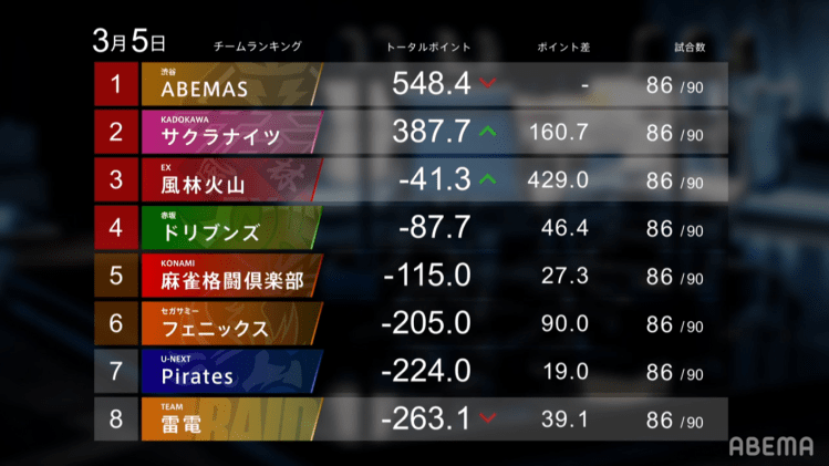 The Shibuya Abemas take 1st place in the League and 2nd in the performance rankings. Being 1st place in the standings, the Shibuya Abemas played to give themselves a bigger lead going into the semifinals. The team actually reached +702.7 at one point in the week, making it the highest team score in M-League history. The team ends the season with an record of 25/30/17/18 with +654.7pts.