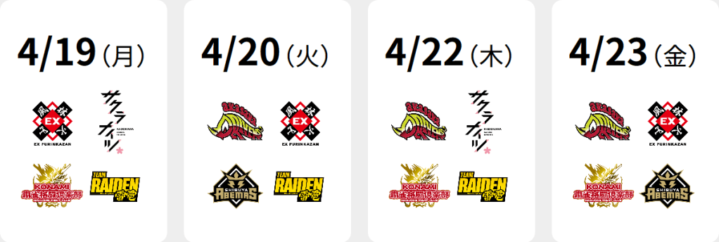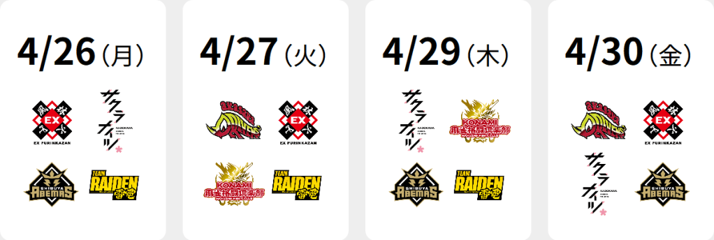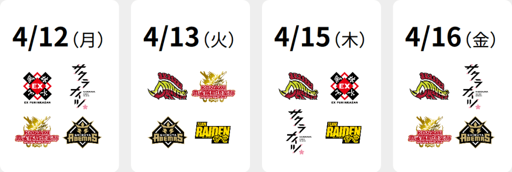 Games will take place every Monday, Tuesday, Thursday and Friday from April 12 to April 30. All games will start at 19:00 JST.