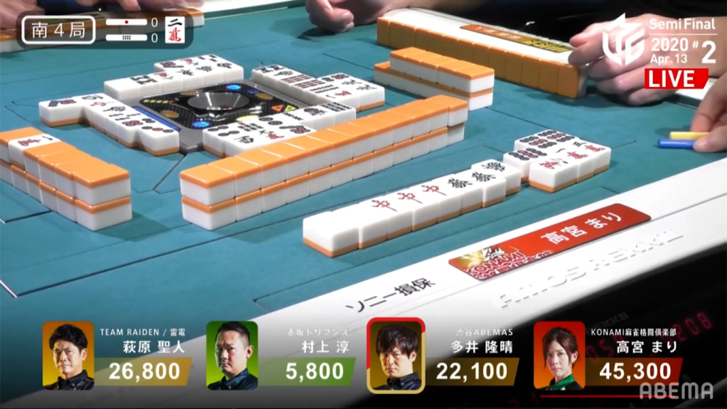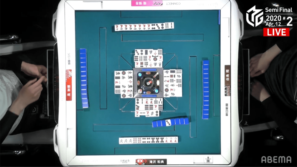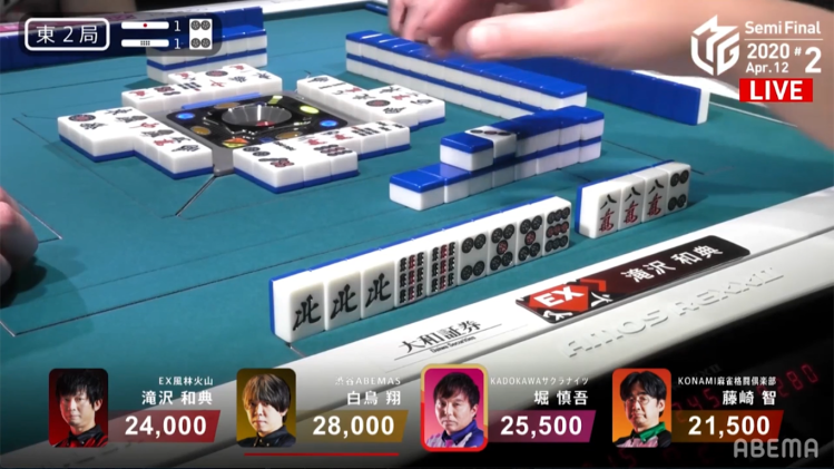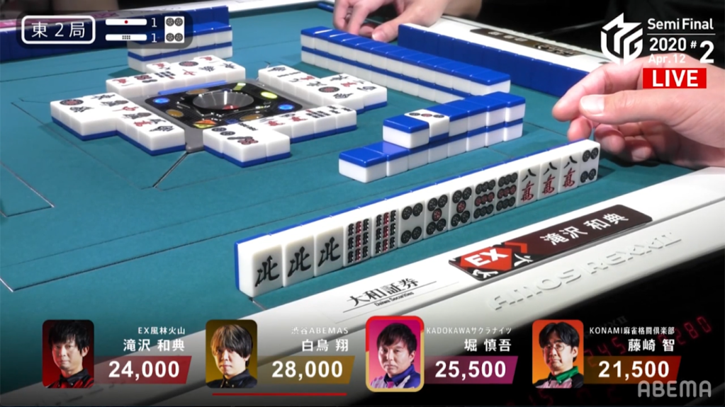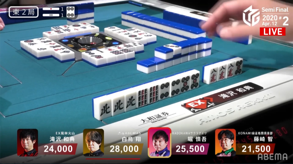 In E2-1, Takizawa is in 3rd place, but the game is young. With Takizawa’s blocks more or less set, he got rid of dangerous tiles early in the 1st row, As Takizawa continued to wait for his hand to develop, Hori challenges the table by calling riichi near the start of the 2nd row. Even so, Takizawa continued to push.