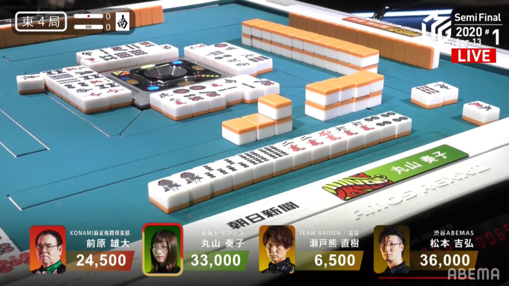 In E4-0, Maruyama is in 2nd place and is very close to 1st place Matsumoto. Early on, Maehara makes some early calls and gets to tenpai early, making it seem like it wasn’t Maruyama’s time for a comeback. Added onto the fact that her hand was primed for chiitoi, a slow hand didn’t seem like it was going to win against a fast called hand. However, Maruyama pushes on and manages to get to tenpai in the 2nd row. With the tenpai, Maruyama decides to call riichi and wait on the 5m. Despite a middle wait being so bad, the fact that she has the red 5m is good enough to warrant a riichi. Her riichi is rewarded, as she ends up drawing her winning 5m near the start of the 3rd row. Maruyama wins with Riichi/Tsumo/Chiitoi/Aka 1/Ura 2 for 3,000/6,000.
