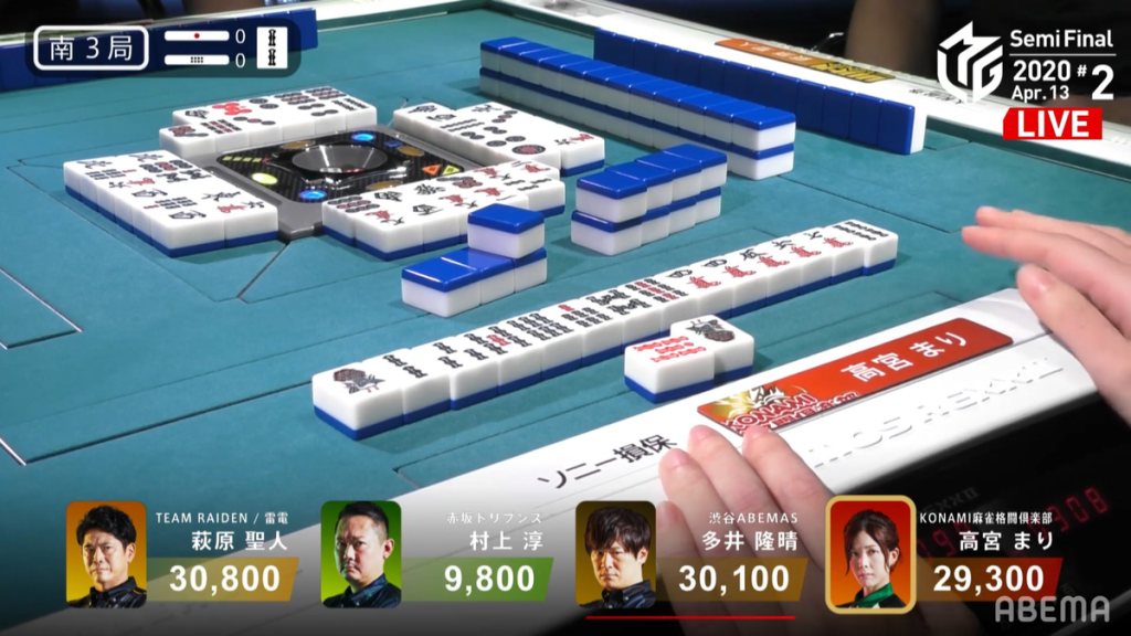 In S3-0, Takamiya is in 3rd place and is 1,500 from the lead. Her hand progressed normally and aimed towards the most efficient route of pinfu. Through her discards of terminals and honours, she eventually got to tenpai near the end of the 3rd wall. She decides to call riichi on a 47s ryanmen wait for Riichi/Pinfu/Dora 1, with the 4s also giving ittsuu. The commentators were counting how many of her waits were left in the wall and they thought that there were 0 left. However, to their surprise, they miscounted and Takamiya ended up winning by drawing the takame 4s. With hysterics in the commentary both, Takamiya wins the hand with Riichi/Ippatsu/Tsumo/Pinfu/Ittsuu/Dora 1/Ura 1 for 4,000/8,000 for the lead.