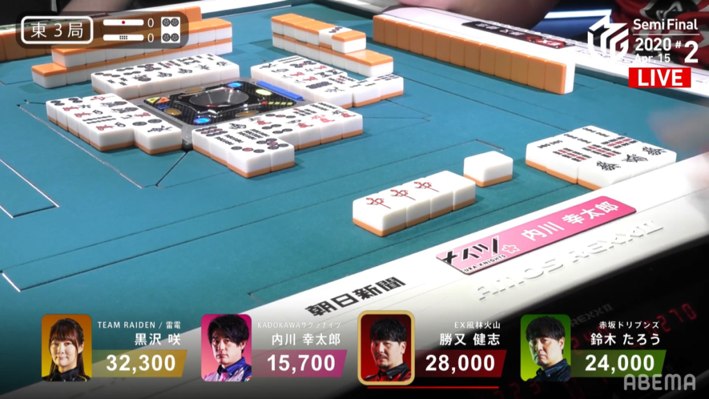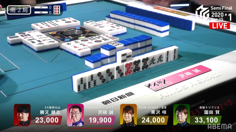In S2-0, Sawazaki is the dealer and in 4th place. The start of the hand was dominated by efficient closed play all around. The first player to break the silence was 1st place Sonoda,who called pon on the green dragon to try to rush his hand in the middle of the 2nd row. Katsumata also adds to the rush, calling pon on the 5s to get to tenpai on a 3m. Even with the two fast hands, Sawazaki kept his hand closed. At the end of the 2nd row, Sawazaki draws a 2nd ankou and one turn later, he draws a 3rd ankou to get to tenpai for toitoi and a chance at suuankou. To slow down the others and to add points, he calls riichi on a 2s/north shanpon wait.