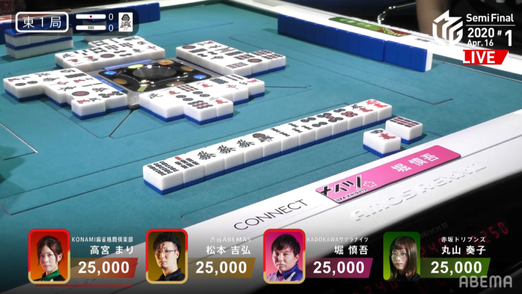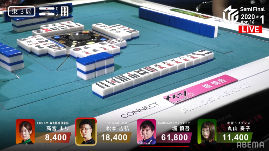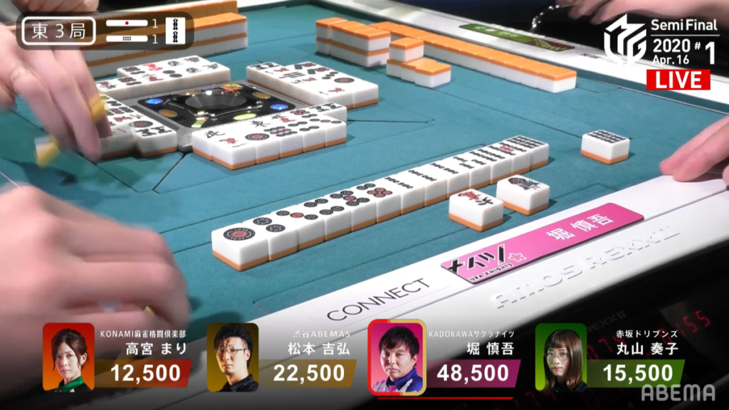 In E3-0, nobody starts out with close to tenpai hands. Takamiya is the closest with a 3-shanten chiitoi, while Maruyama and Hori are both 4-shanten from a standard hand. Approaching the end of the 2nd row, both Maruyama and Hori are tenpai while Takamiya and Matsumoto are iishanten. With a call, Matsumoto gets himself into a yakuless tenpai and Takamiya gets a good draw in order to get to chiitoi tenpai and call riichi on the dora tanki. With the riichi call, it forces Maruyama and Matsumoto to take evasive action while Hori holds on. The hand ends with Takamiya and Hori both in tenpai