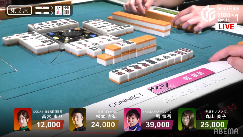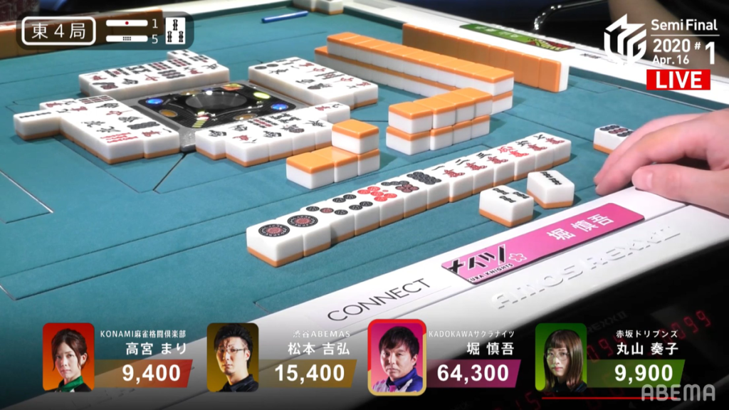In E1-0, Hori starts out with an ankou of green dragon. Despite this good start, he is not the first one to get to iishanten. Both Takamiya and Matsumoto are able to get some good hands and build their hands faster. The first player to get to tenpai is Matsumoto, who does so near the end of the 2nd row with a 36s ryanmen wait. Soon after, Hori gets to tenpai and calls riichi on a 58s ryanmen wait. Soon after him, Takamiya calls riichi on a 58p wait. With three riichi calls, it was just a waiting game. The standoff ended when Takamiya discarded Hori’s winning 8s near the start of the 3rd row. Hori wins the hand with Riichi/Green Dragon/Dora 1/Aka 1/Ura 2 for 12,000.