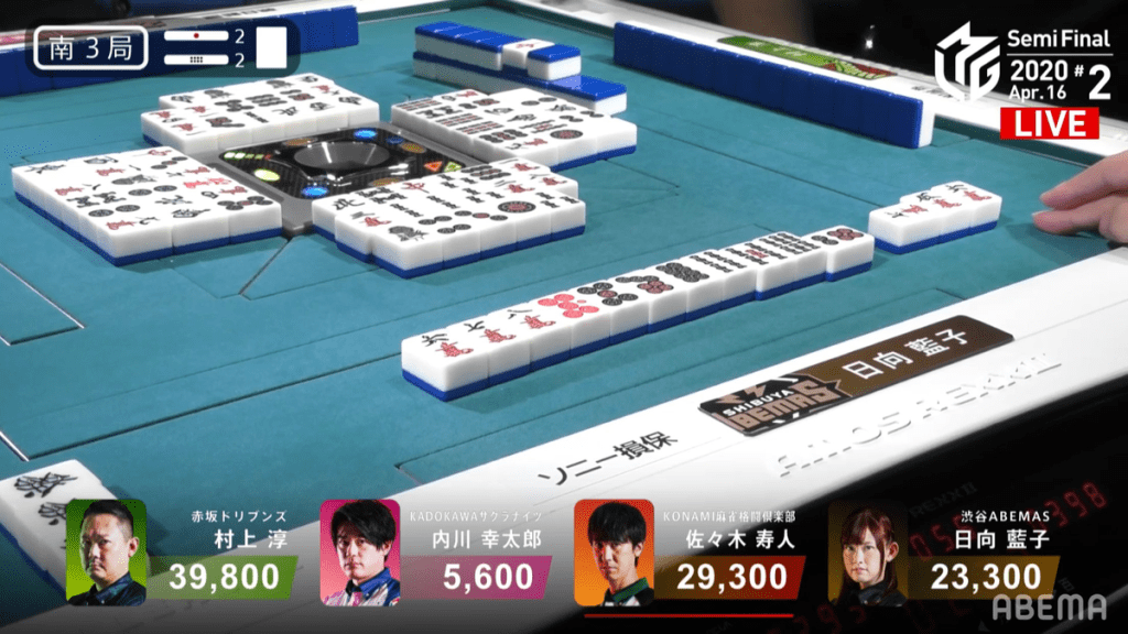 In E3-0 is in 4th place and is looking to not lose all the points that Sonoda earned in the previous game. Taro’s hand starts out very well, but his first three discards weren’t. With the first three discards, he ended up discarded the 8p three times. Nevertheless, his hand is still good and is iishanten by the end of the 1st row. At the start of the 2nd row, Taro has the choice to be tenpai and be satisfied with a sanankou. However, he decides to dream bigger and aim for a suuankou, despite having already discarded an ankou. Challenging Taro is Kurosawa, who pushes for a honitsu and makes some good progress. However, it has some difficulty rivaling Taro’s hand, who gets to tenpai on the suuankou chance and calls riichi on a 2s/4m shanpon wait. In the 3rd row, Kurosawa incredibly keeps pushing and gets to tenpai on a 7s penchan wait for her honitsu. Immediately after, Taro draws the 2s to get the legendary win. Taro wins the hand for suuankou for 8,000/16,000 to take 1st place.