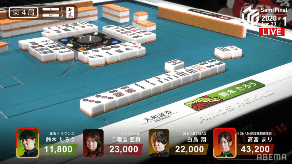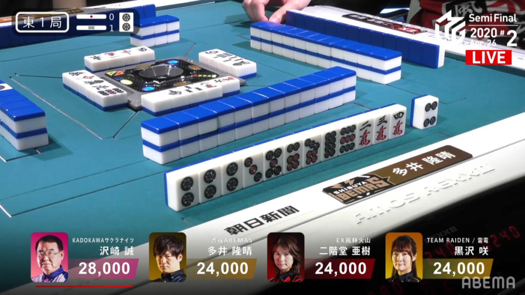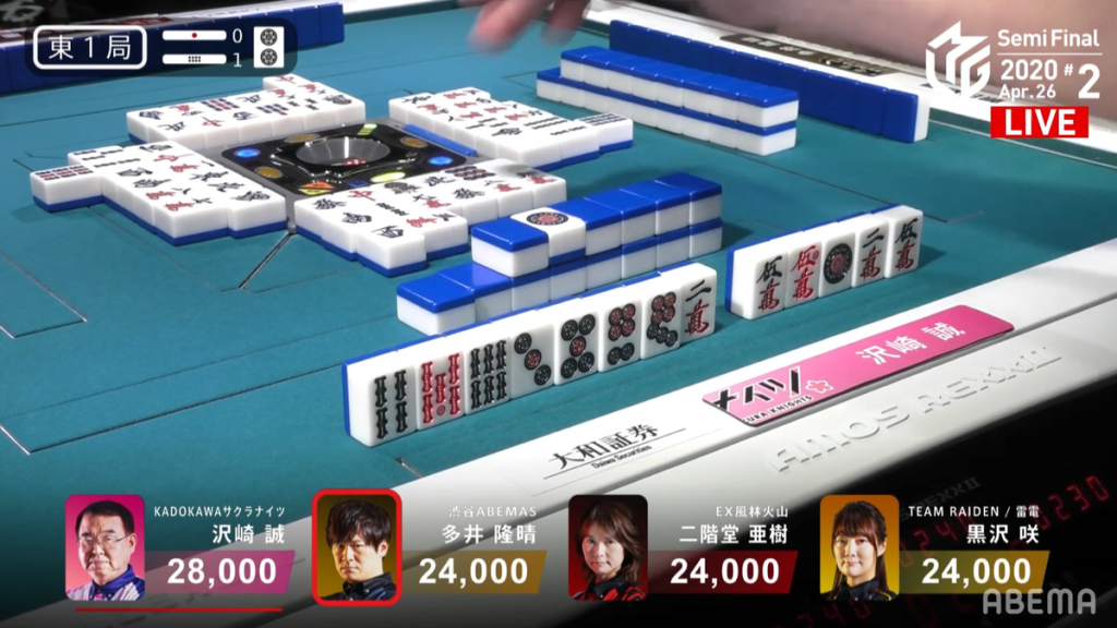 In E1-0, Sasaki didn’t have a particularly interesting starting hand. In fact, more attention was paid to Sonoda, who was holding two dragon pairs. With an easy starting hand, Sonoda calls a chii on the 8s in the middle of the 2nd row to get to iishanten and pon on the red dragon to get to tenpai for a simple yakuhai-only hand. Soon after, Sasaki surprises us and gets to a chiitoi tenpai with two dora and a red dora in hand. Staying dama on a 4p tanki wait, he caught Sonoda by surprised when he calls ron on his 4p discard in the middle of the 3rd row. Sasaki wins the hand with Chiitoi/Dora 2/Aka 1 for 8,000