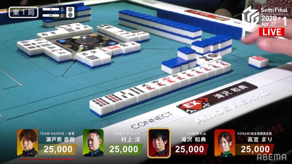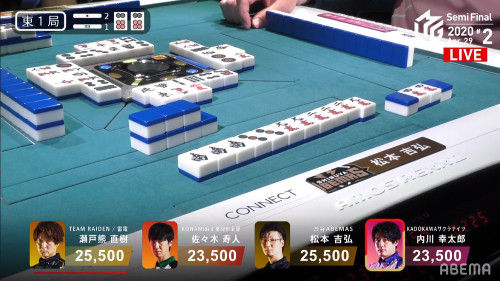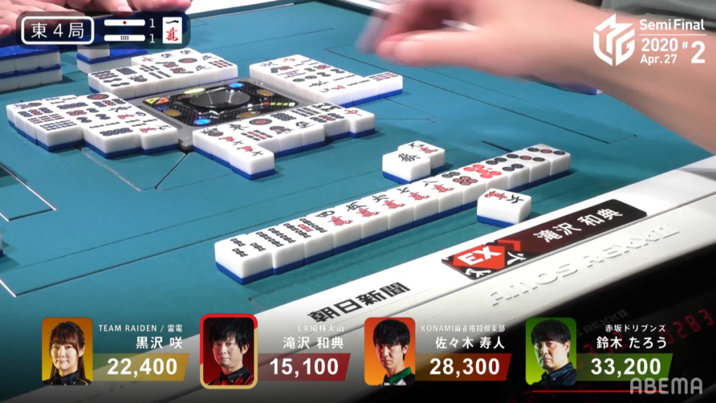 After an unfortunate 7,700 deal-in after a textbook riichi and a South 4 dama mangan deal-in while trying to get out of last caused Takizawa to lose the first game, Katsumata was sent out to get the EX Furinkazan into the finals. Being only 9.2pts ahead of the Konami Mahjong Fight Club, the team needed a 1st place, a 10,800 or higher 2nd place or a 30,800 or higher 3rd place. If the team fails to make it to the finals, all three of them will be dropped by the team. Katsumata Kenji will be the one to decide the fate of his own career and that of his teammmates.