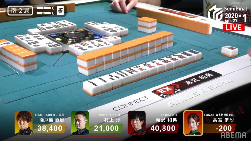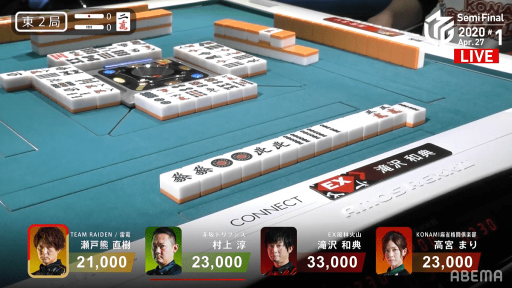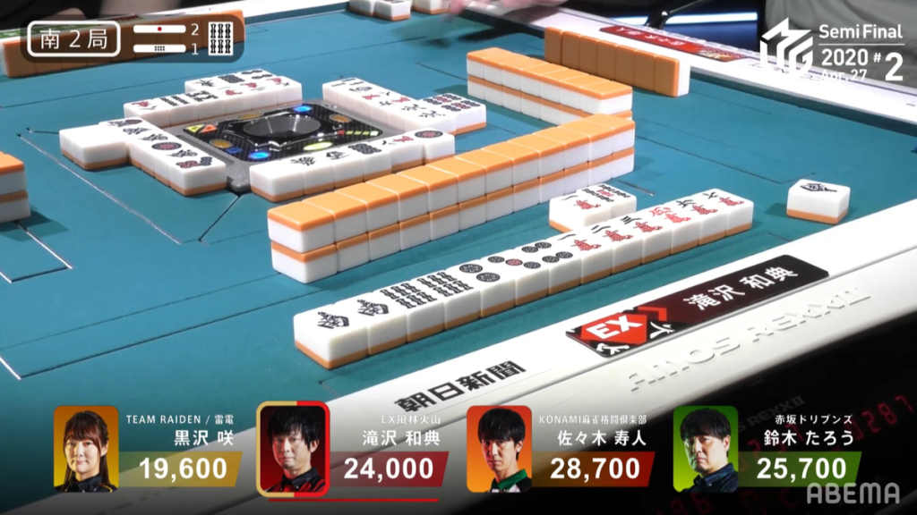 Skipping forward to S2-0, Takizawa is in 1st place, but 2nd place Setokuma is only 2,400 away. At the start of the hand, it doesn’t look like Takizawa was going to win the hand, as Takamiya starts out with a chiitoi iishanten by turn 5. In the middle of the 2nd row, Takamiya gets to tenpai on a 7p tanki. Takizawa manages to sculpt his hand and gets to tenpai on a 7p kanchan as well. See the movement around the table, Takamiya decides that the 7p is a good enough wait and calls riichi at the end of the 2nd row. However, within the first go-aound, Takizawa draws the 7p to win a Tsumo/Tanyao/Iipeikou hand for 1,000/2,000.