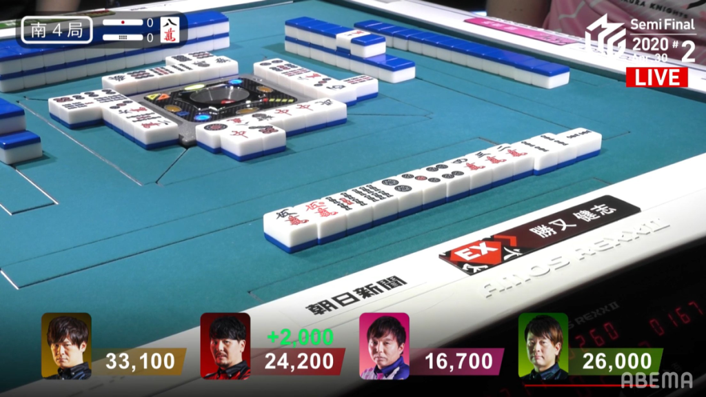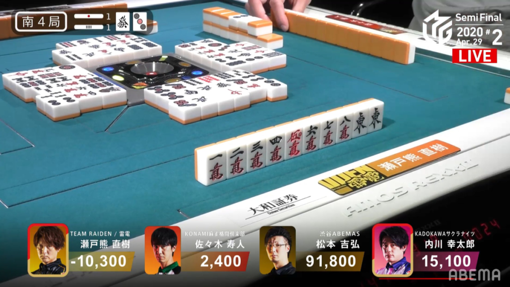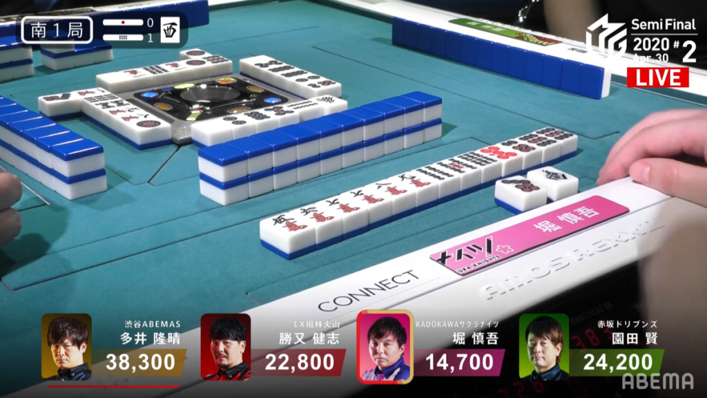Fast-forwarding to S1-1, Katsumata is currently in 3rd place with 22,800. Though Katsumata tries his hardest to get a good hand, he is unable to challenge a turn 5 riichi from Hori. With no safe tiles left in hand by the start of the 2nd row, Katsumata discards the 7p since Hori had previously discarded an 8p and 5p prior to the riichi. Unfortunately it deals into Hori’s 47p ryanmen wait and gets a Riichi/Pinfu/Aka 1 hand for 3,900 points. WIth the deal-in, Katsumata drops to 4th place.