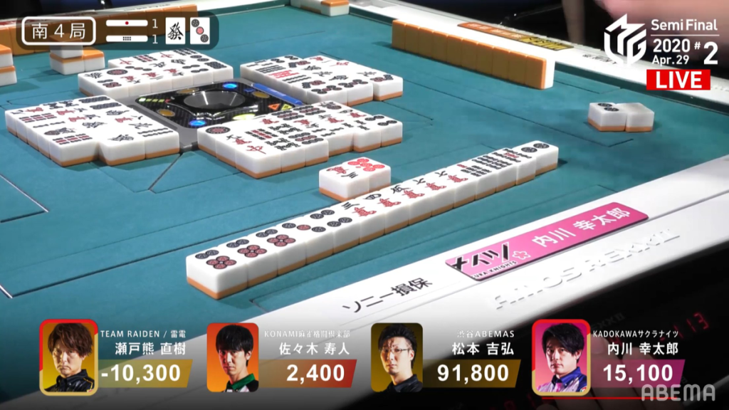 In S4-1, Setokuma is trying desperately to get a good result for his team. He is already at -10,300 after suffering from the dealer penalty of Matsumoto’s suuankou and a few other mishaps. Being 12,700 from 3rd place Sasaki and there being a riichi stick and one honba on the table, a haneman is just enough for him to maintain his dignity. He starts out his hand at 2-shanten. The wall isn’t too kind to him, as he struggles to get closer to tenpai. Setokuma does call an ankan on the wests in the 2nd row, but it wasn’t much help. Looking at Matsumoto, he is within a mangan away of beating Sasaki’s all-time score record of 98,200. With an open Junchan/Sanshoku/Dora 1, he would achieve that success. In the 3rd row, Matsumoto is tenpai on the 2p kanchan. While our focus was on Setokuma and Matsumoto, it was actually Uchikawa that we had pay attention to. Soon after Matsumoto got to tenpai, Uchikawa calls riichi on a 25p ryanmen wait. With a dealer riichi, Matsumoto decides to fold, but Setokuma keeps going. On Setokuma’s 2nd-to-last draw, he gets to tenpai and calls riichi on a 369m sanmenchan wait with honitsu and the 9m giving ittsuu. With the last ippatsu draw lining up for haitei, it seemed like the perfect change. Unfortunately, Setokuma draws the 2p and deals the houtei to Uchikawa.
