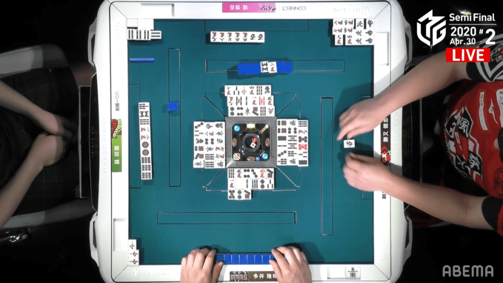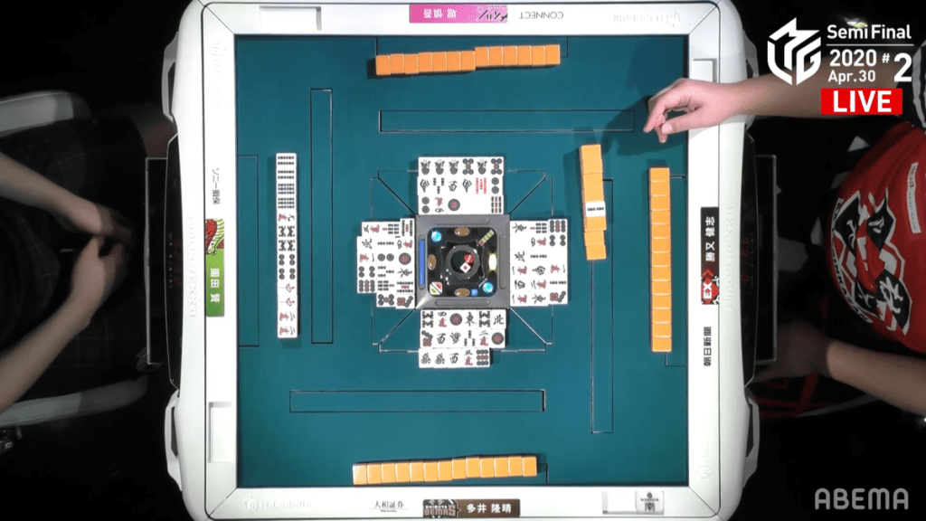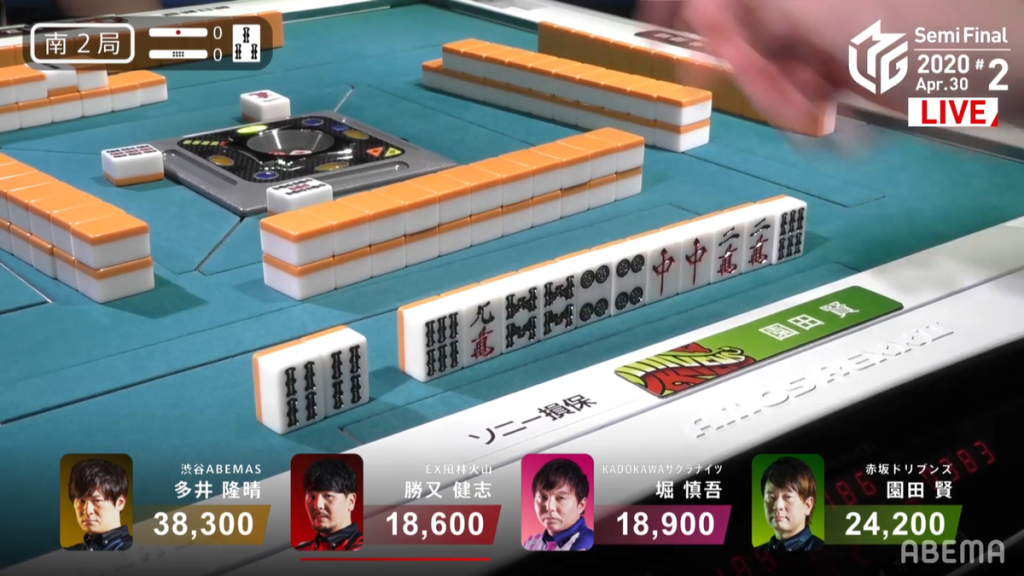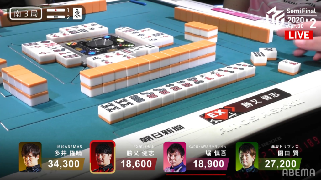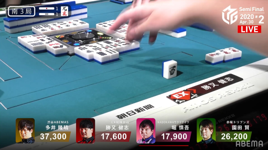 In S3-1, Katsumata knows that he has only two hands to get to at least 2nd place, which is only a mangan away. To push for this mangan, Katsumata calls an early pon on the south for an opportunity to go for toitoi. Soon after, he calls pon on the north and then the 4m to get to iishanten and an option to go for honitsu as well. Seeing Katsumata’s rush, Hori tries to rush the hand by calling pon on the white dragon and gets to iishanten by the end of the 1st row along with Katsumata. The first player to get to tenpai is Hori, who waits on a west dora/3m shapon wait in the middle of the 2nd row. At the end of the 2nd row, Hori discards a 9m, allowing Katsumata to make a 4th call and get to tenpai on a west dora tanki. Interestingly, 2nd place Sonoda is able to get to tenpai near the end of the wall on a 3m penchan wait.
