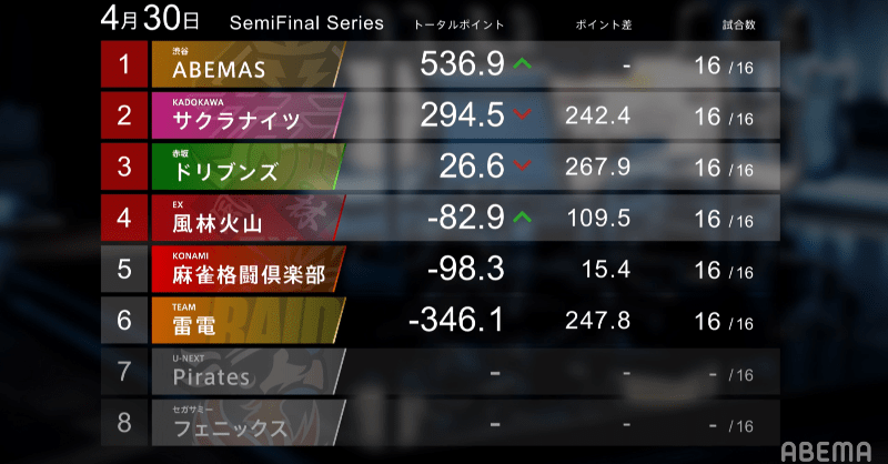 In 1st place in the overall standings is the Shibuya Abemas. The team had an amazing last quarter of the semifinals. With the help of all of the players, the team had an explosive 3-1-0-0 record for +248.9pts, almost doubling their score. In large part for this huge gain is Matsumoto’s suuankou win. Even when their scores are halved, the team will still have a 121.2pt lead over the 2nd place Kadokawa Sakura Knights.
