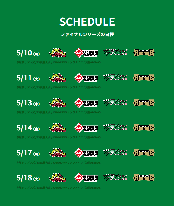 Games will be held on May 10, 11, 13, 14, 17 and 18 starting at 19:00 JST (UTC +9). Each day will consist of two (2) games.