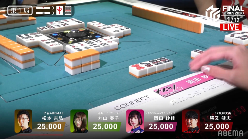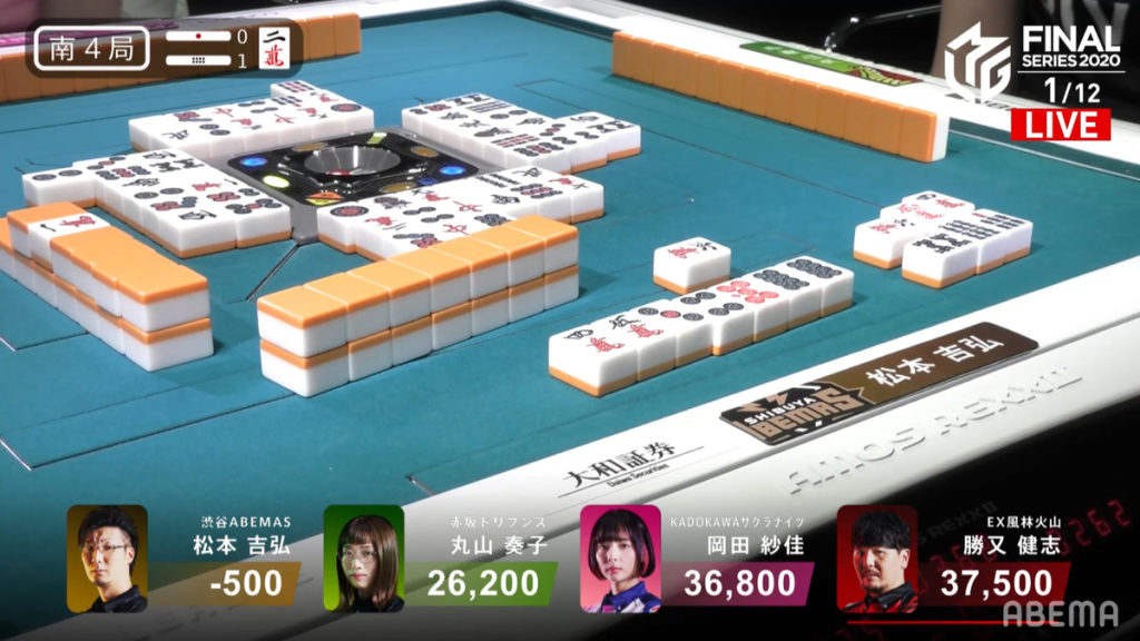 In S4-1, Matsumoto is in 4th place and has no chance of making it out of last. However, he does have an effect on the outcome of the game. Because the difference between 1st and 2nd is 40 points after oka/uma and the fact that the Kadokawa Sakura Knights are the Shibuya Abemas’ closest rival, Matsumoto has to do everything in his power to prevent Okada from taking 1st place. In the first row, Katsumata calls pon on the green dragon to get to a quick iishanten. Though this is a good sign for Matsumoto, it doesn’t guarantee that Okada won’t win the next hand. Okada herself is trying to win the hand, getting to a pairless iishanten by the end of the 1st row with a single dora and a completed iipeikou shape. Matsumoto makes his first move by calling chii in the 2nd row, getting to iishanten. The first of the three major players to get to tenpai is Okada, who waits on a 47m ryanmen wait. Immediately after, Katsumata gets to tenpai on a 14s ryanmen wait and Matsumoto gets to tenpai on a 36m ryanmen wait. Even though Matsumoto’s 3,900 point hand is good value, it’s not very good for preventing an Okada 1st. If Katsumata were to deal in the winning tile or if Matsumoto were to draw it himself, it would drop Katsumata down to 2nd, so Matsumoto would have to tread very carefully. Luckily for him, Okada ends up dealing in the 6m for Matsumoto to win the hand and Katsumata to win the game. Matsumoto wins the hand with Tanyao/Aka 2 for 3,900+300.