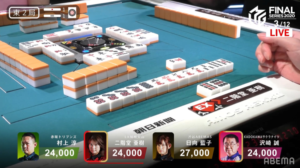 In E2-2, An early riichi on a 7s dora tanki wait from Murakami causes a simple fold for everyone and that hand ends in a ryuukyoku with Murakami the only one tenpai.