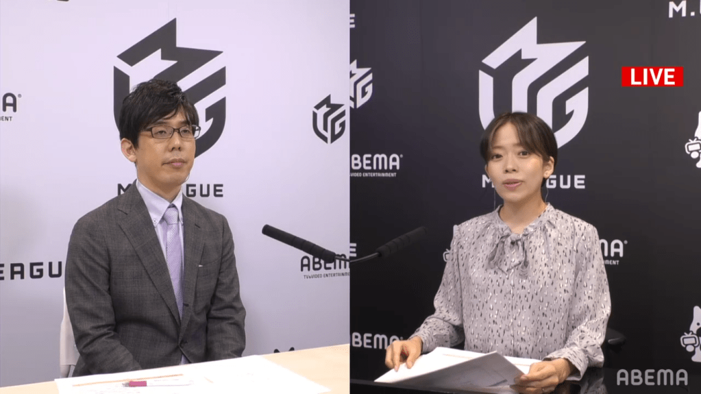 As always, we were introduced to our two commentators of the day Kobayashi Misa and Shibukawa Nanba. After some cool shots of the M-League Championship Plate, we watched a recap of Tuesday’s games and then looked at how the teams stacked up after 4 games.