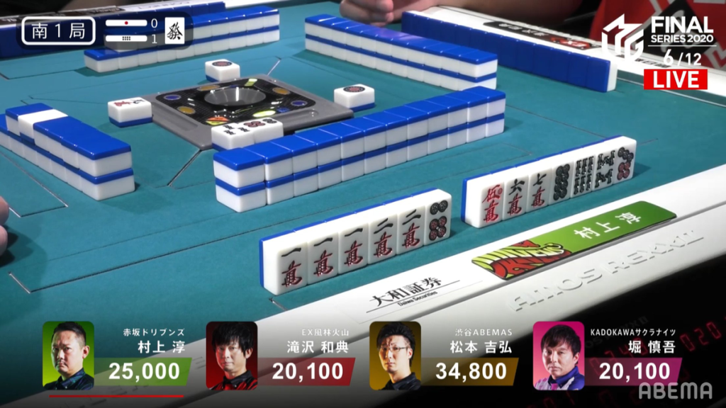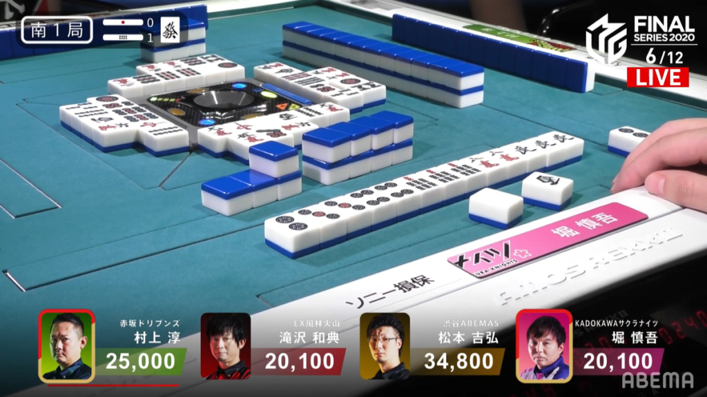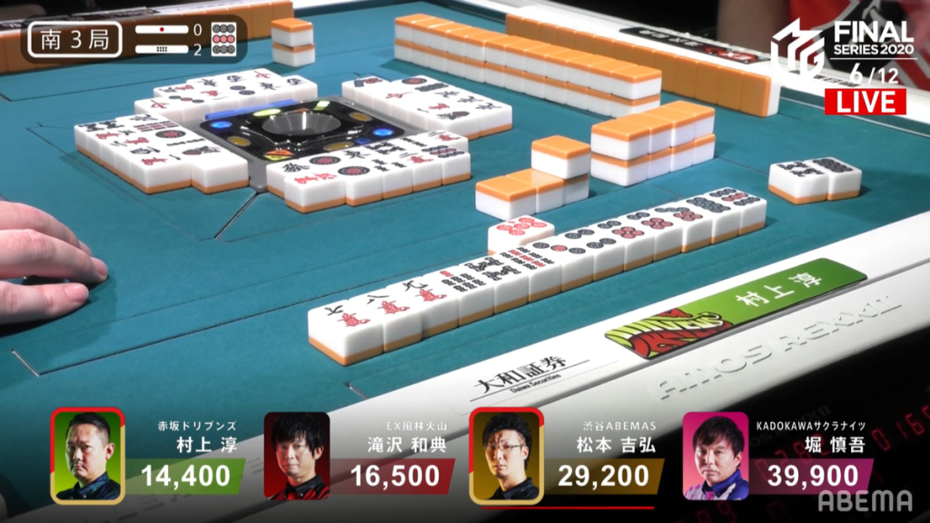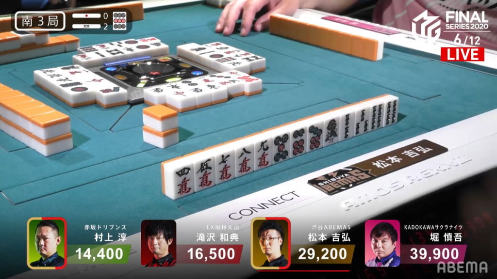 Murakami wins the hand with Riichi/Pinfu/Sanshoku/Dora 1/Aka 1/Ura 1 for 12,000+600, plus Matsumoto’s riichi stick. With the win, Murakami goes from 4th to 2nd, while Matsumoto falls from 2nd to 4th.