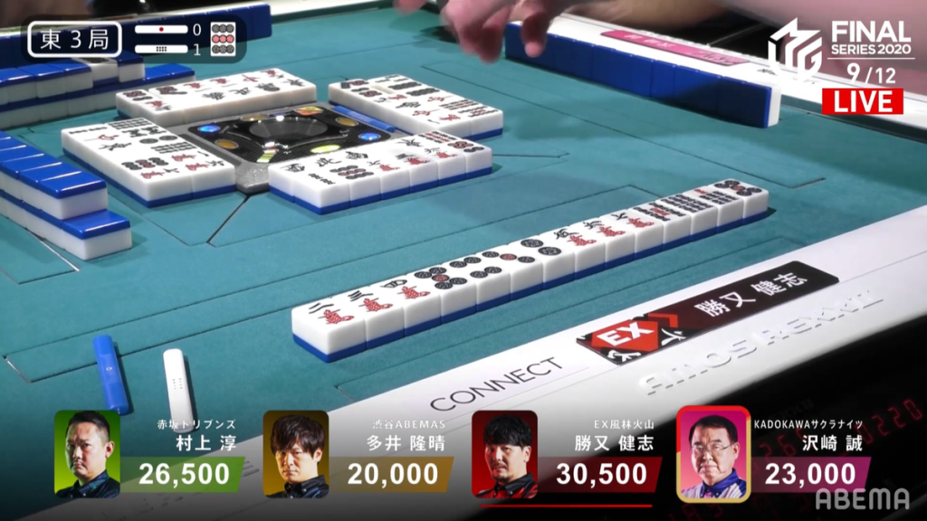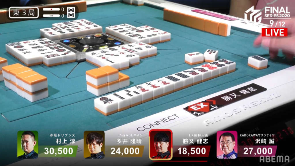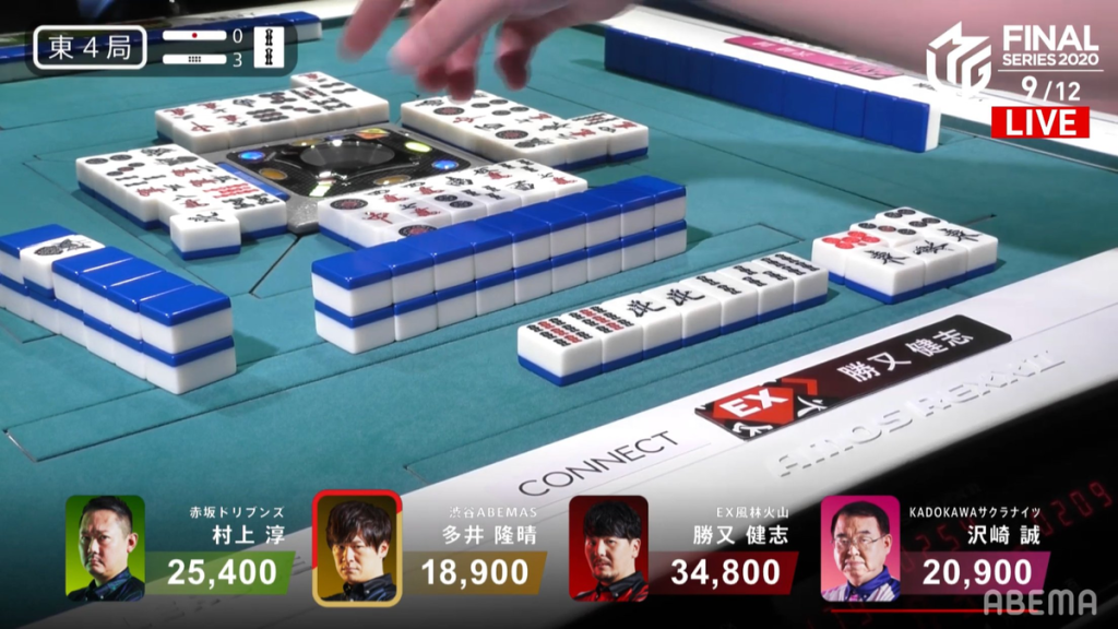 In E3-0, Katsumata is in 4th place and needing to get out of 4th for the team to have a chance to win the championship (or, at the very least, not get 4th in the standings). Hi hand progression is slow, but it was faster than everyone else. At the end of the 1st row, he is 2-shanten and in the middle of the 2nd row, he is iishanten. Near the start of the 3rd row, Ooi tries to scare the table by calling pon on the 8s dora. A few turns later, Katsumata calls riichi and waits on a 7p/8p shanpon wait. On the ippatsu draw, Katsumata finds the 8p to win the hand. Katsumata wins with Riichi/Ippatsu/Tsumo/Aka 1 for 4,000 all. With the win, it puts Katsumata into 1st place and gives him a 4,000 point lead.
