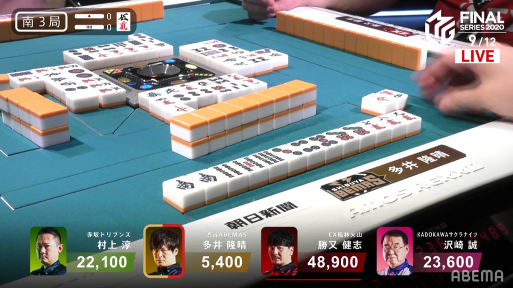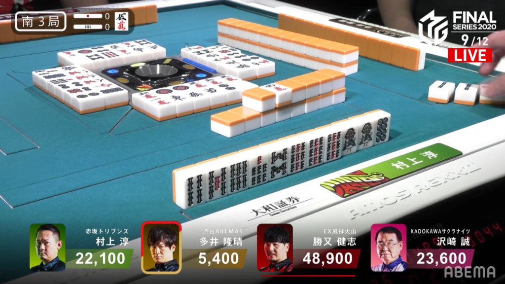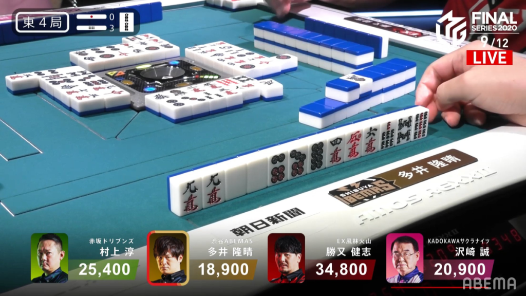 In E4-3, Ooi is in last place and needs to get ahead of the Kadokawa Sakura Knights in order for the team to not fall out of 1st place. Katsuamta is also wanting to gather some points, trying to get close to the top of the pack. Katsumata starts out with a pair of norths and a pair of easts. When the east is discarded, Katsumata easily calls pon to get to 2-shanten. By turn 4, Katsumata gets to iishanten. When the red 5p comes out, Katsumata calls chii to get to tenpai on a 9s/north shanpon wait, with the north giving mangan. Near the end of the 2nd row, Ooi manages to get to tenpai and calls riichi on a white dragon/9m shanpon wait. With a terminal and honour wait, Ooi has a pretty good chance of winning his 5,200 chance hand. However, on his ippatsu turn, Ooi draws and discards the north and deals into Katsumata.