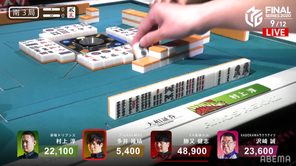 In the end, Katsumata discards Ooi’s 7p suji and deals into Ooi for Riichi only for 1,300.