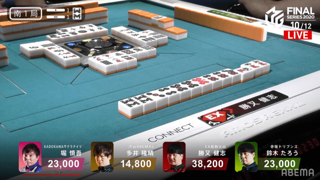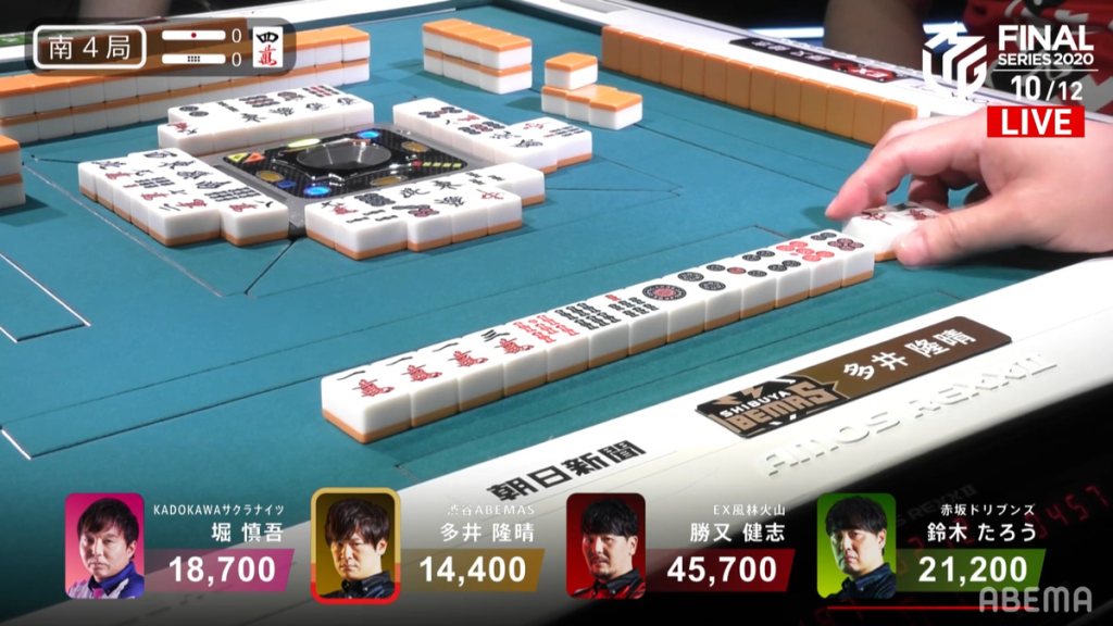 In S4-0, Ooi is in 4th place, 4,300 behind 3rd place Hori and 6,800 behind 2nd place dealer Taro. If Ooi can get to 2nd place, then the Shibuya Abemas would surpass the Kadokawa Sakura Knights. and potentially take back 1st place. Ooi starts out the round with a 2-shanten hand. On turn 5, Ooi has a choice to get into tenpai. Holding two red dora, adding riichi would be enough to take 3rd, with tsumo bringing the hand to mangan. However, the 6s kanchan wait seemed a bit to difficult to complete, so Ooi discarded the 3s pair to find a better wait. Soon after, Ooi ends up drawing the 6s, an unfortunate mangan miss. However, he is tenpai and calls riichi on a 23m wait. With Hori needing to avoid 4th and a decent chance at going to 2nd, he continues to push. Near the end of the 2nd row, Hori draws the 2m.