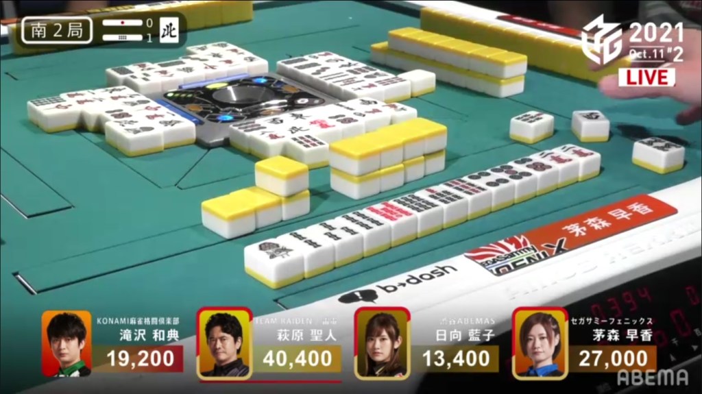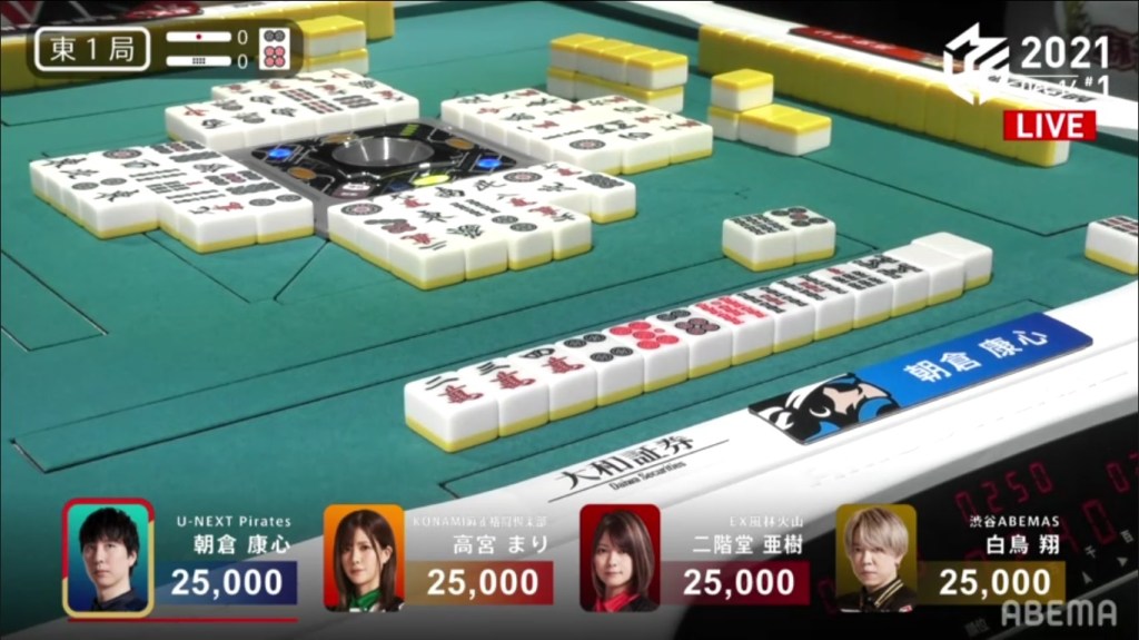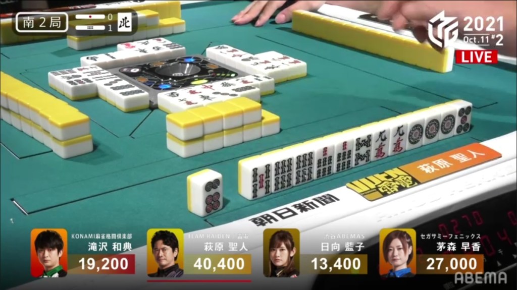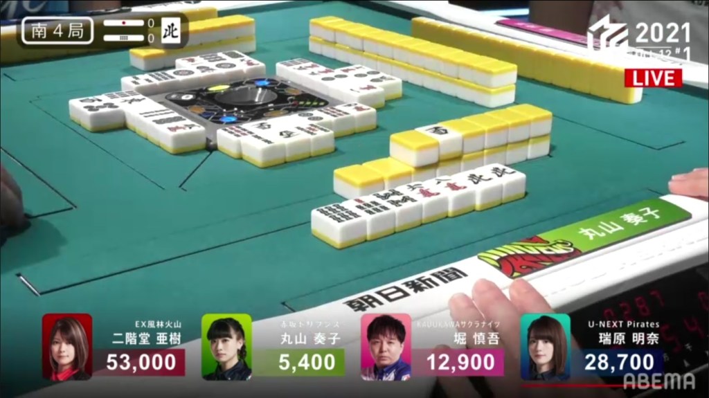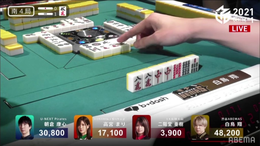 In S4-2, Shiratori starts out 3-shanten while Asakura is 4-shanten with no dora. From just that, it seems like Shiratori’s gamble worked. By turn 4, Shiratori has a ryanmen-ryanmen iishanten while Asakura lingers at 3-shanten with only a potential tanyao for value. However, from there, the tables turned. On turn 5, Asakura gets to 2-shanten after filling in a kanchan. On turn 6, he gets to iishanten. With his 6778s shape, drawing a 6s or 8s would give him an opportunity for iipeikou. On turn 8, he successfully draws the 8s and calls riichi on a 69s ryanmen wait. If Asakura draws the 6s and finds one more han, he would get the haneman and win the game. The prospects look grim, as there is only one more 6s in the wall. With perfect luck, Asakura draws the 6s on his ippatsu turn. Asakura wins with Riichi/Ippatsu/Tsumo/Pinfu/Tanyao/Iipeikou for 3,000+200/6,000+200 to win the game. With the win, it give the U-Next Pirates their first win of the season.