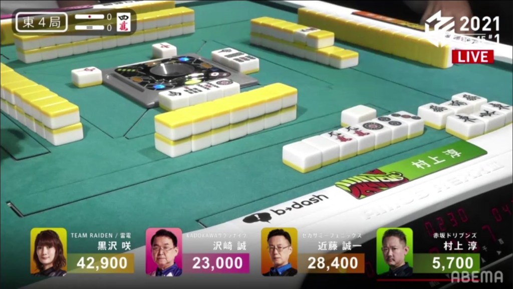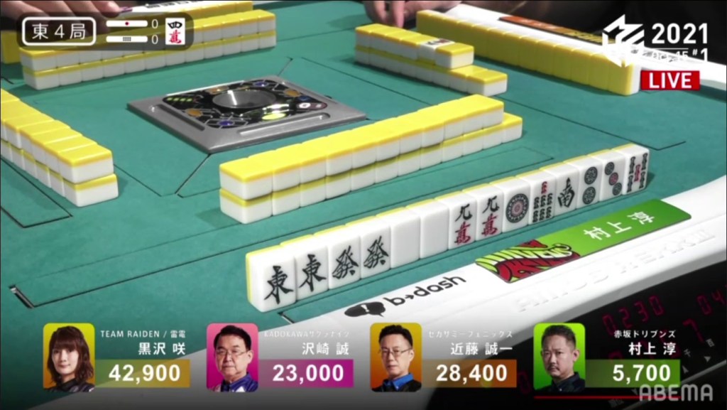 In E4-0, Murakami is the dealer is in deep 4th place after dealing into two mangans in a row. With his starting hand, he holds pairs of the east, green dragon, white dragon and 9m, as well as a completed 123p sequence. With the objective clear, Murakami calls pon on the east, the 3rd discarded tile in the game. On the 6th discard of the game, the green dragon, Murakami calls pon again to get to tenpai on a 9m/white dragon shanpon wait. Kondo hasn’t even discarded yet and already Murakami is tenpai.