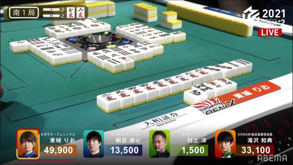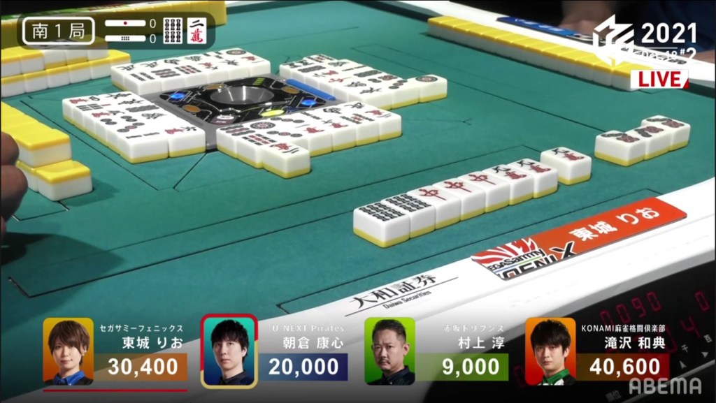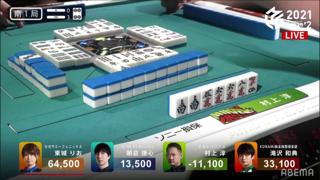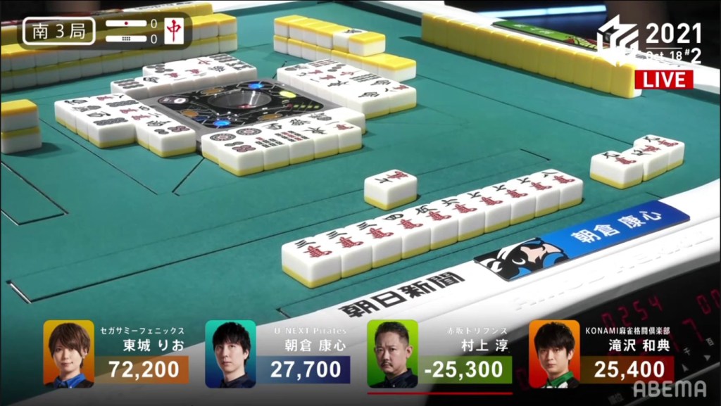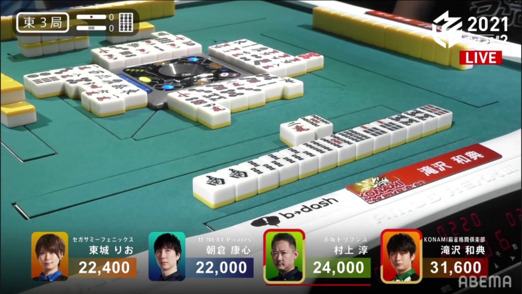 With everyone holding onto everyone else’s waits, the hand naturally went to a draw with Asakura and Tojo the only ones tenpai.