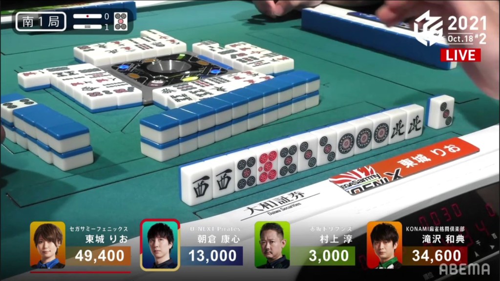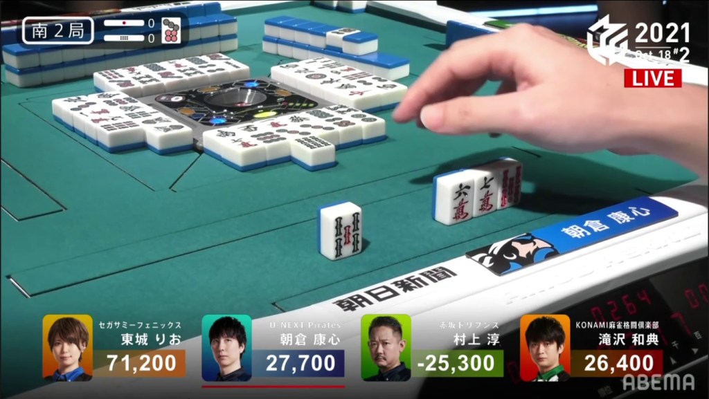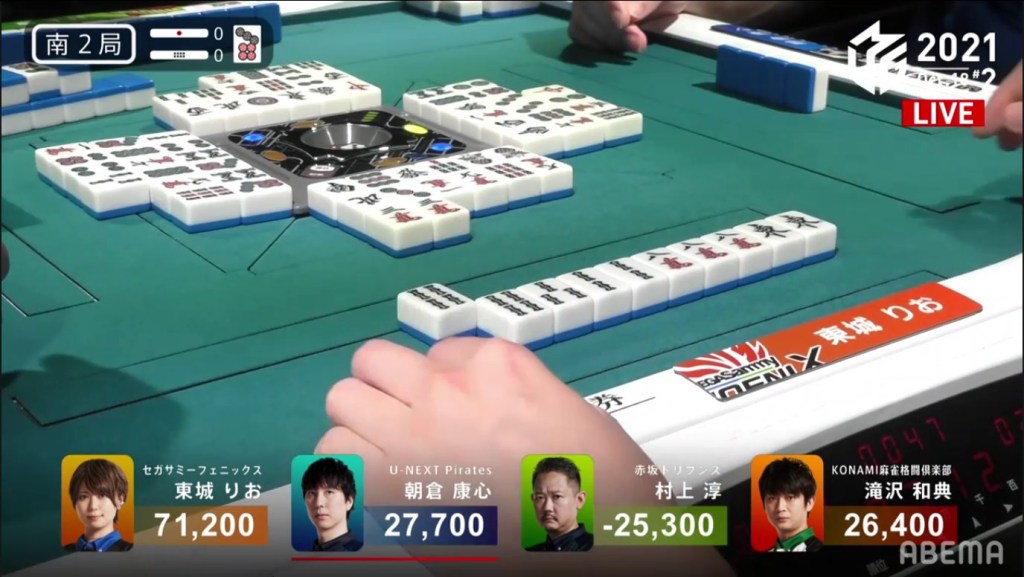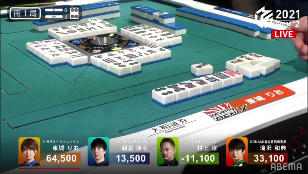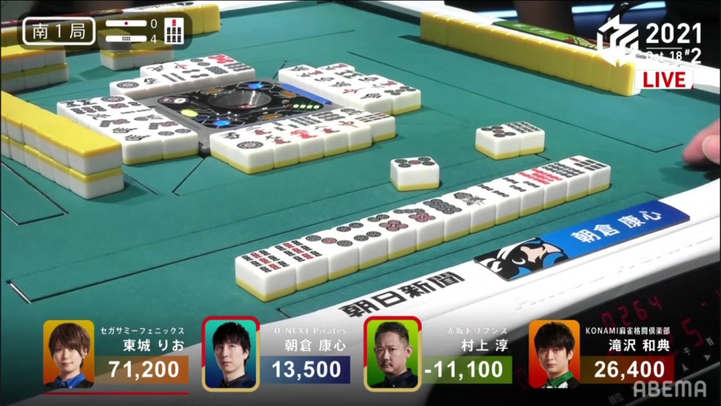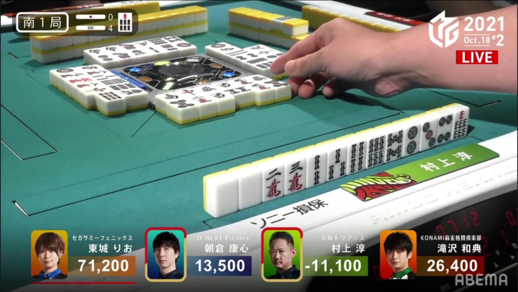 Revealing one uradora, Asakura wins the hand with Riichi/Ippatsu/Pinfu/Dora 1/Aka 1/Ura 1 for 12,000+1,200, as well as Murakami’s riichi stick.