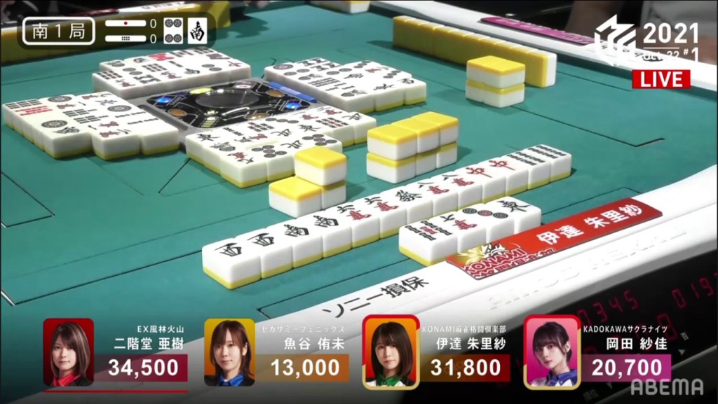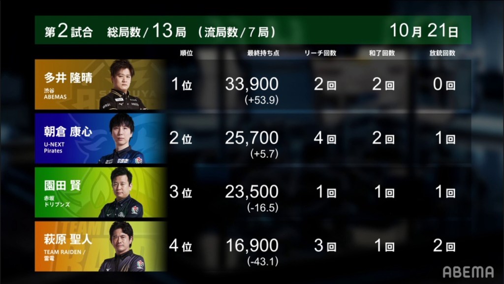 The second game on October 21 (Game 21 of the M-League Regular Season) was quite the unusual game. 7 out of the 13 hands, more than half of the hands played, went to a draw.